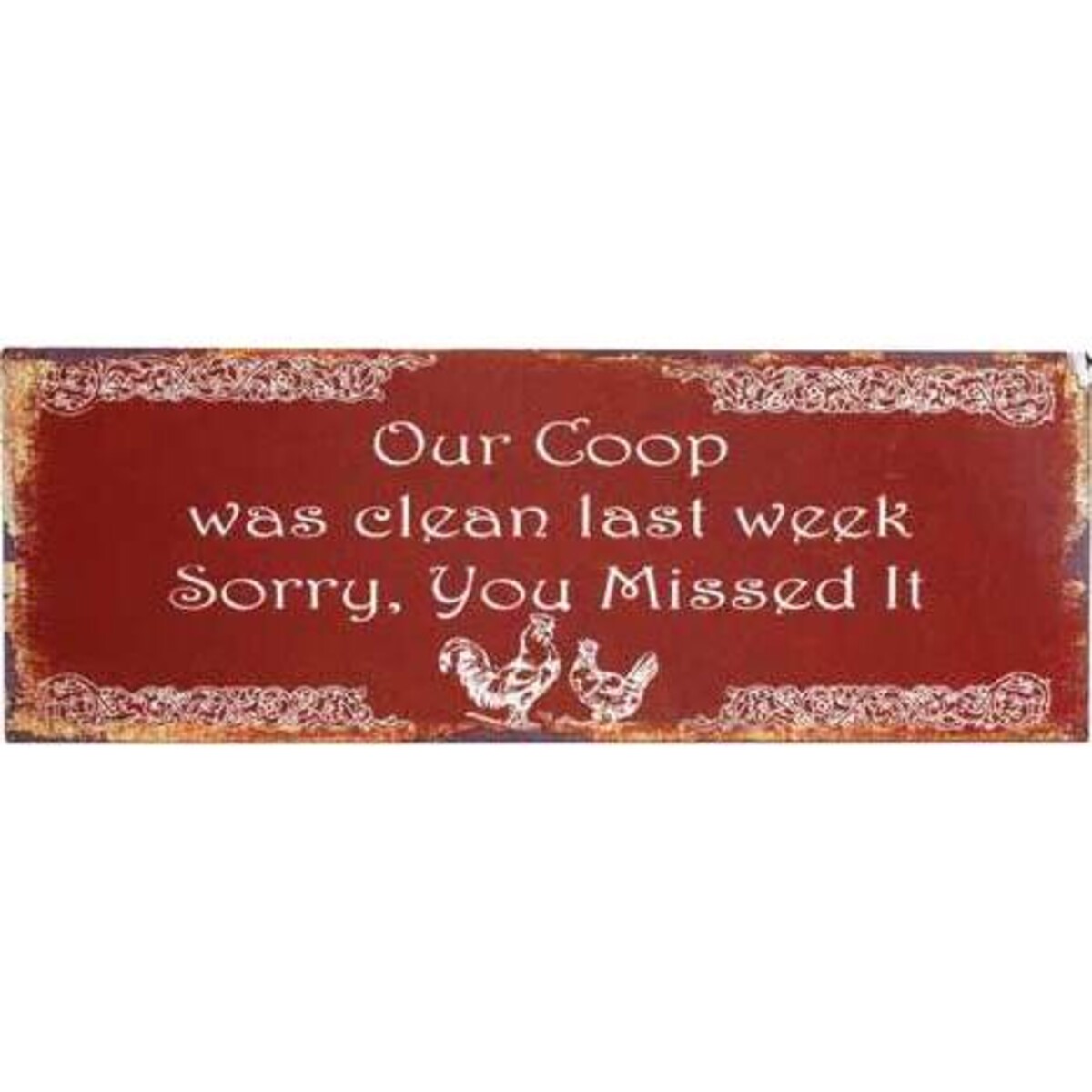 This horizontal red sign features a white horizontal swirl design in each corner with the images of two white chickens at the bottom. In the center in white lettering reads, "Our coop was clean last week. Sorry you missed it." The edges of the sign are worn to give it an extra charming look. It's the perfect cheeky little piece for someone who adores chickens, and knows that a house doesn't always necessarily have to be spotless to be perfect. Thanks to its size, you can fit the sign almost anywhere whether it's above a doorway or smack in the middle of your foyer.