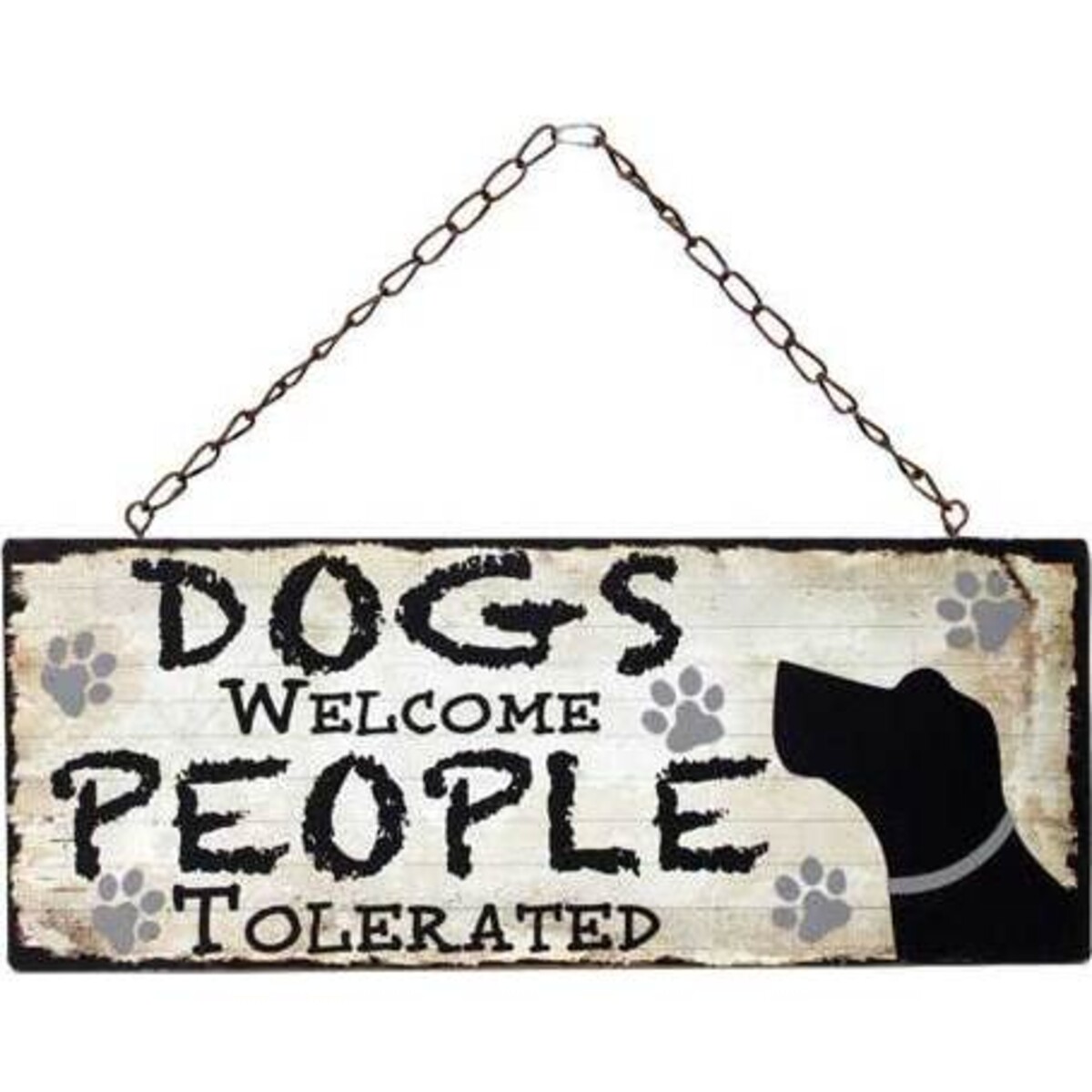 This rectangular sign features a white background that says, "Dogs welcome people tolerated," in dark black print. The image of a collar-wearing dog is in the corner, a dark border surrounds the edges, and gray paw prints dot the piece. A dark chain is attached in a loop at the top to allow for easy hanging. The entire piece has been aged to give it a charming weathered look. Whether you hang this outside or indoors, it's going to make a perfect addition to your home.