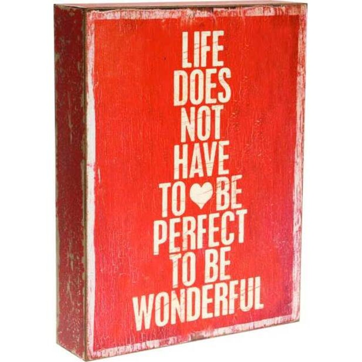 "LIFE DOES NOT HAVE TO BE PERFECT TO BE WONDERFUL" is the clear message delivered by this dynamic sign that is ideal to liven a room with positive thoughts. Made in a boxy construction with a natural, aged style, the sign will easily meld into many environments with its lively and fresh feel. The sign is framed with a white border to draw the eye to the message in large capitals that can be read quickly and effortlessly. In the centre, a heart shape further emphasises the warm, romantic sentiment and is sure to create a positive atmosphere. Ideal for designers and homeowner who are not afraid to experiment, the vivid colours will grab the attention of visitors and be popular with people of all ages and backgrounds. Unique and unmistakably original, this sign leaps out with its message, but ultimately has a friendly and welcoming tone.