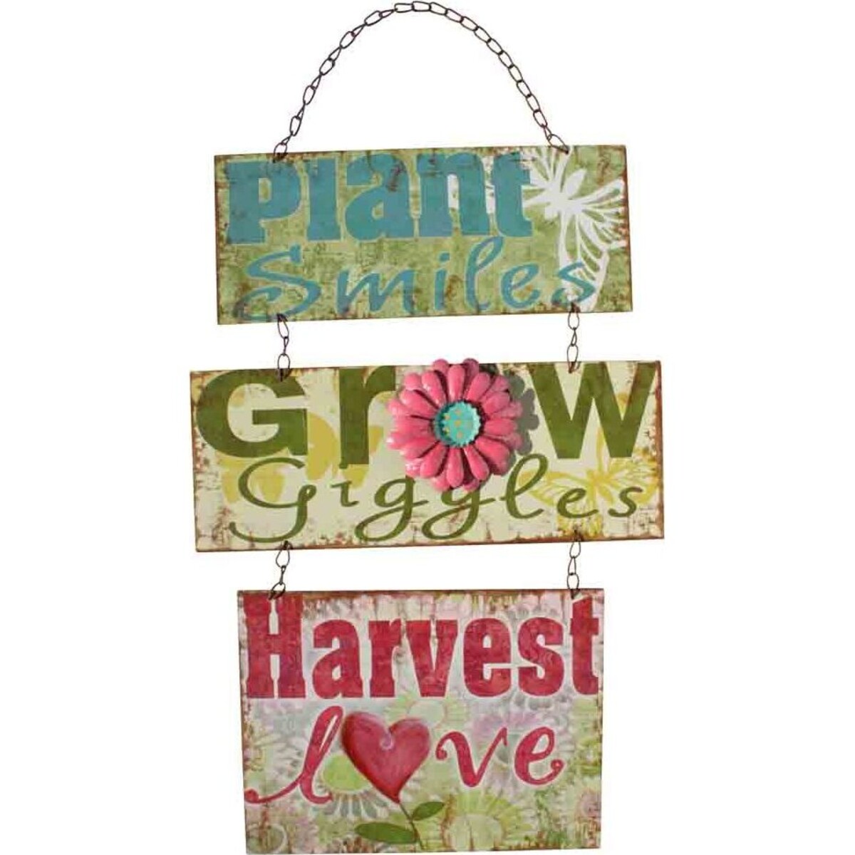 By design, this wall art comes with three separate sign boards. These three sign boards are arranged vertically and are connected to each other by way of chains. From top to bottom, the boards feature the short messages 'Plant Smiles', 'Grow Giggles', and 'Harvest Love'.