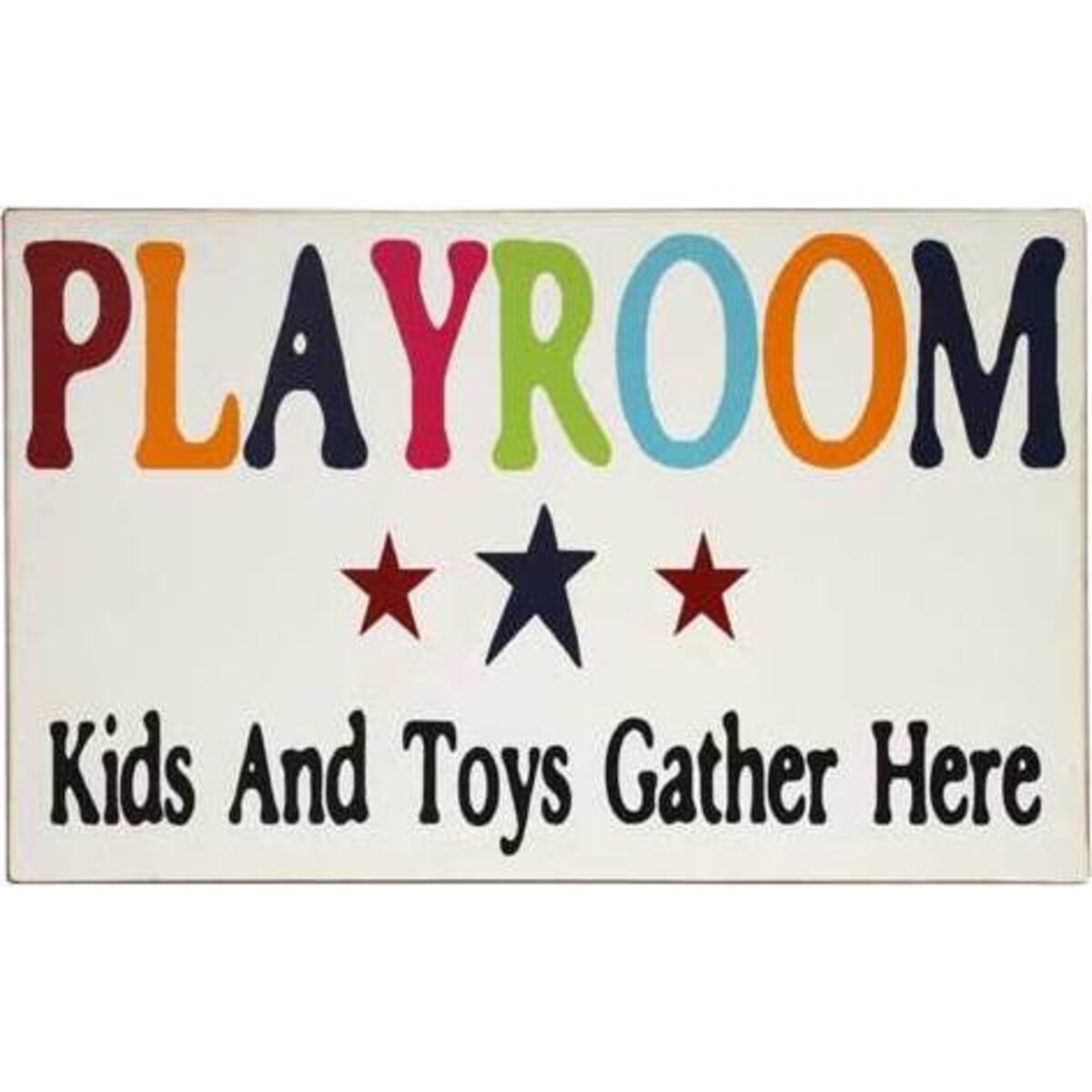 The Sign 'Playroom Kids and Toys Gather Here' is meant to alert guardians and parents of where to settle in their young ones while attending to chores at the office or other place. The word 'Playroom' is done in capital letters and an array of mainly dull colours. Three stars adorn the middle in characteristic style, presenting the message even in closer and even closer manner to the observer. 'Kids and Toys Gather Here' is a plainly set underneath in upper case.