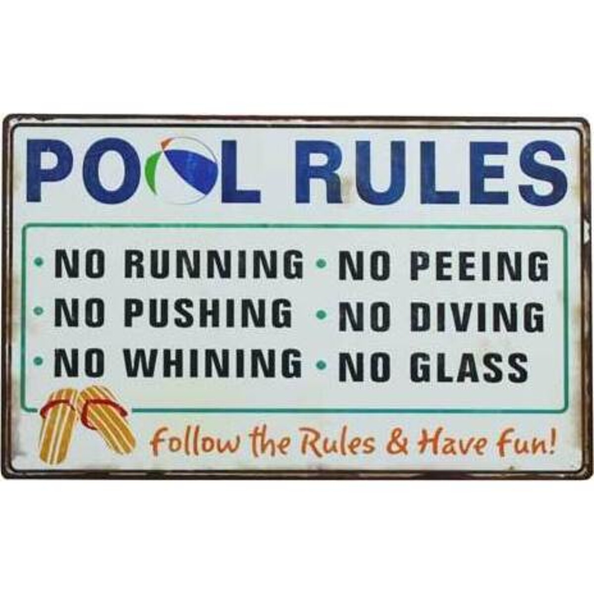 These horizontal white signs feature with the wording that reads, "Pool Rules; no running; no peeing; no pushing; no diving; no whining; no glass; follow the rules & have fun," in bold lettering. A little pair of flip flops decorates the bottom. There's darkening around the edges of the sign to give it a slightly weathered look. These signs are ideal to hang all around your pool to ensure that everyone sees them regardless of where they're standing or swimming. They're great for at home pools as well as pools that are open to the public.