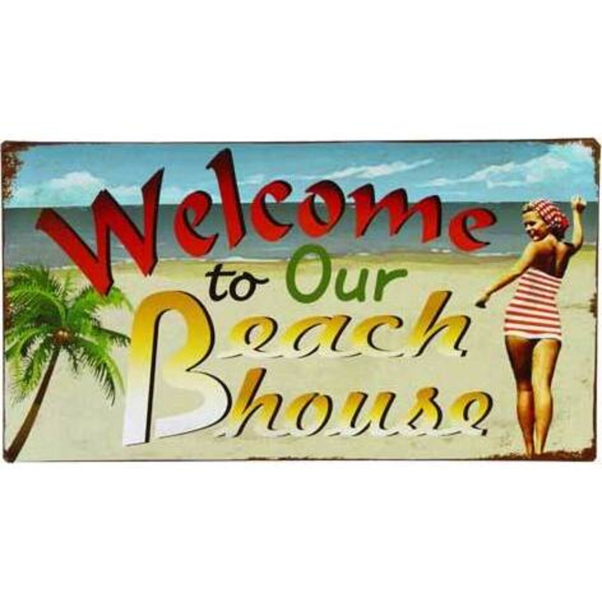 This retro-themed sign displaying the words "Welcome to our beach house" is appealing on a number of levels. Not only does it accurately capture the fun-filled vibe of the beach, but it will bring to mind images of frolicking in the sand, bonfires and parties, family events, sun-kissed skin and bright, cloudless days. With its clear, vivid colours of red, green and blue, it will instantly transport you to another time and place and evoke the nostalgia of good times and happy memories. Ideal both for individual purchase and gift-giving, it is an article that will effortlessly fly off the shelves as it sells itself. Made out of tin and with dimensions of 24x13cm, this sign can be hung anywhere and has a theme that is nice for home, restaurant or party decor to be created around.