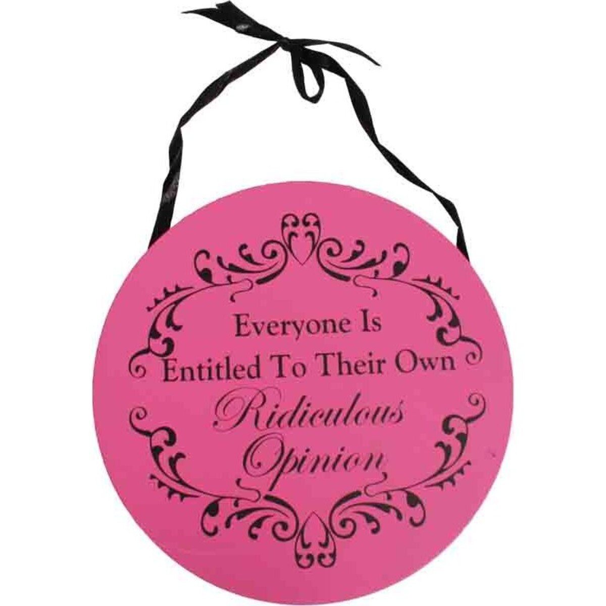 Sign - Ridiculous Opinion highlights the round frame in light lavender shade. The centre of the frame showcases elaborative and deluxe patterns with a regal twist in black palette. The framed texts say EVERYONE IS ENTITLED TO THEIR OWN RIDICULOUS OPINION. The wordings have very classy font in matching black colour. It has the matching and attached black sheer ribbon for the hanging or display purposes.