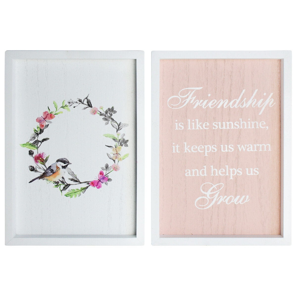 A charming set of 2 framed friendship signs, each measuring 20x2x28cm, that celebrates meaningful relationships and makes a lovely addition to gift displays or home decor. Made from durable MDF in soft hues, one features a delightful bird and floral motif while the other offers a heartfelt quote about friendship - 'Friendship is like sunshine, it keeps us warm and helps us grow'. These signs appeal to customers looking for thoughtful gifts or a little something special for their own homes.