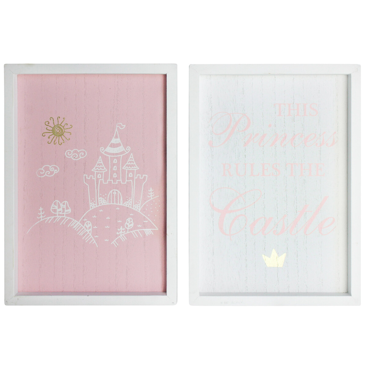 The soft blush pink palette feels modern yet sweet. One frame features a whimsical castle sketch with a cheerful sun; the other says it all: 'This Princess Rules the Castle.' The subtle gold foil crown detail is a nice finishing touch and looks great under spot lighting in-store. They brighten up any corner without being over-the-top.
