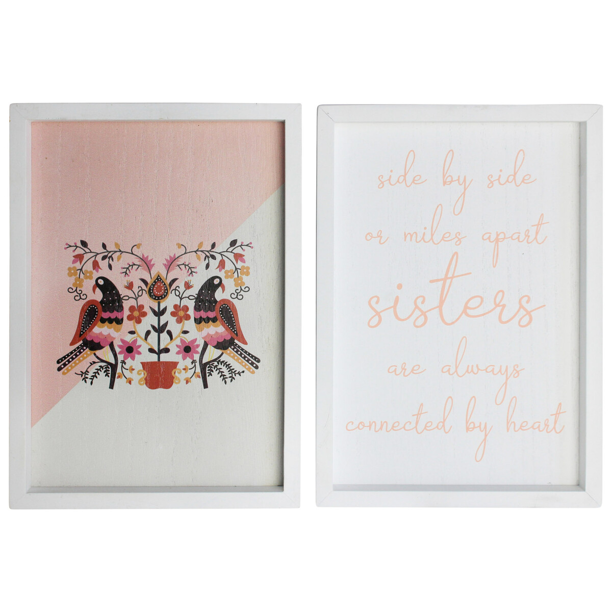 The soft pink, white and brown colour palette means it's well suited to a wide range of tastes, from coastal chic to country style. The adorable bird print on one sign adds an extra touch of whimsy, while the message on the second piece really pulls at the heartstrings: "Side by side or miles apart, sisters are always connected by heart." Measuring 20x2x28cm and crafted from MDF, this sentimental set is ready to place in any space.