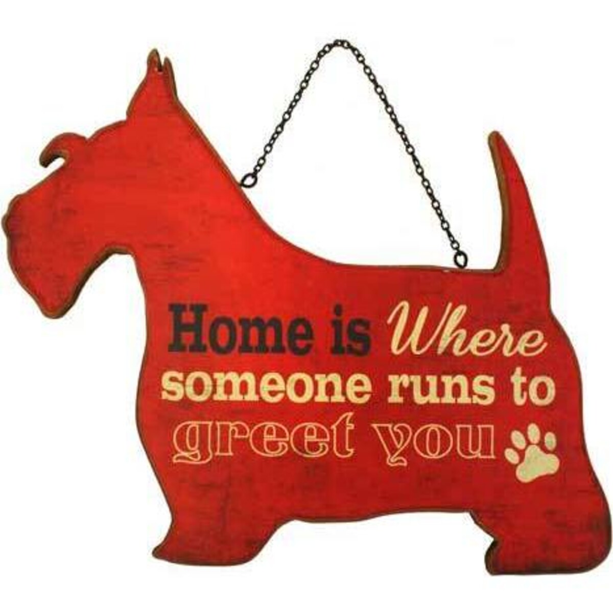 These red signs are in the shape of Scottie dogs, and feature the words, "Home is where someone runs to greet you," in black and cream - coloured lettering. A little cream - coloured paw print is the final touch. At the top is a small chain that allows for easy hanging. You're going to love putting these signs where you can see them on a daily basis, such as right by the front or back door. They also make wonderful gifts for those who love Scotties just as much as you do.