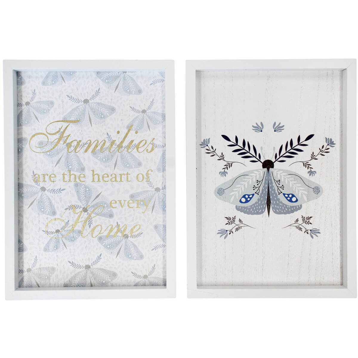 The first piece features the uplifting “Families are the heart of every Home” in beautiful gold script against a delicate butterfly pattern. The second shows an elegant stylised butterfly on lightly-textured MDF. Both pieces measure 20x2x28cm so they’re versatile enough for tight hallways or bigger feature walls in modern apartments or family homes.