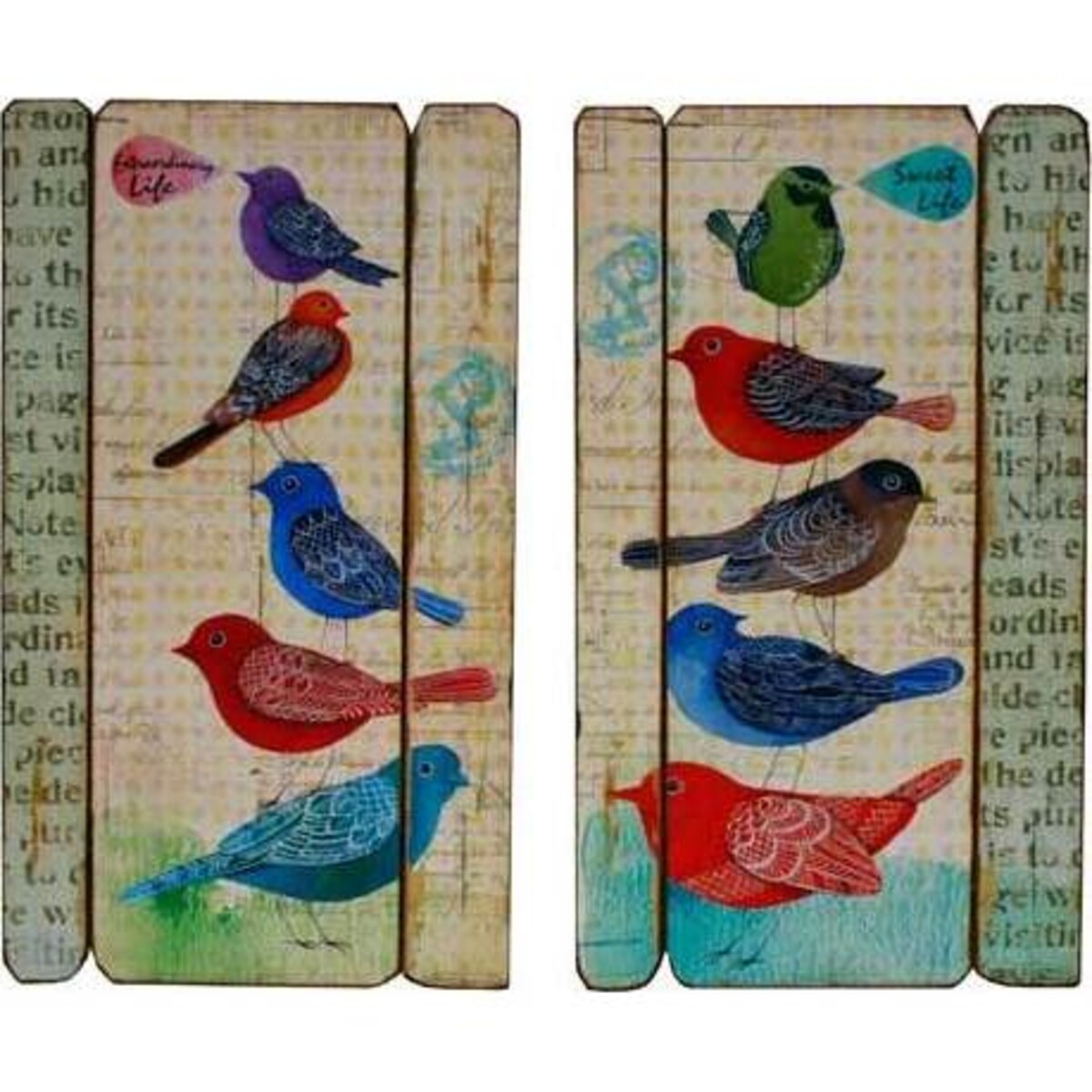 These signs are beautifully crafted to display colourful birds forming a stack and imbuing a wholly positive theme. The backgrounds are lightly coloured and contain interesting fragments of parchment and subtle textures that further emphasis the vibrant colours of the birds. At the top of each stack, the smaller bird announces a positive statement about life to promote the 'feel good' message of this wonderful set. With its natural, rustic nature, this set of signs is ideal for many areas of the home or in external areas. Highly versatile, the signs can be displayed together or apart, and can mix easily with other works of art and styles of decor. The signs can be appreciated by all the family, and young children will love to count the birds and name the colours. Each sign is spilt into three vertical sections, making for an original and visually attractive concept.