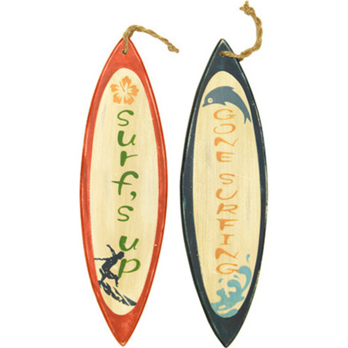 There are two ornaments for the Sign Surfing Set 2. The ensemble includes two oblong shaped signs with pointy edges at the top and bottom. Both signs are accentuated with the petite brown knotted handles for easy hanging mechanics.
