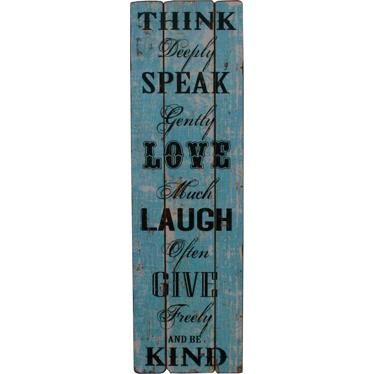 This highly attractive sign is large and prominent at 35 x 117 cm. Positive thoughts and messages are printed in black in a variety of fonts on to the length of the sign. "THINK Deeply", "LOVE Much", and "GIVE Freely" are just some of the messages for friends and family to ponder. With its simple, effective colouring of black against a rustic worn blue, the sign has a wholly natural and easygoing look that is easy to blend into many environments in the home or outside in the patio or garden areas. The sign really does feel part of a traditional-style fence and purveys a strong outdoor atmosphere with its aged look. The messages will encourage a 'feel good' mindset - a positive and caring attitude wherever it is placed. This makes it perfect as a gift or as a useful fill-in idea for homeowners and designers.