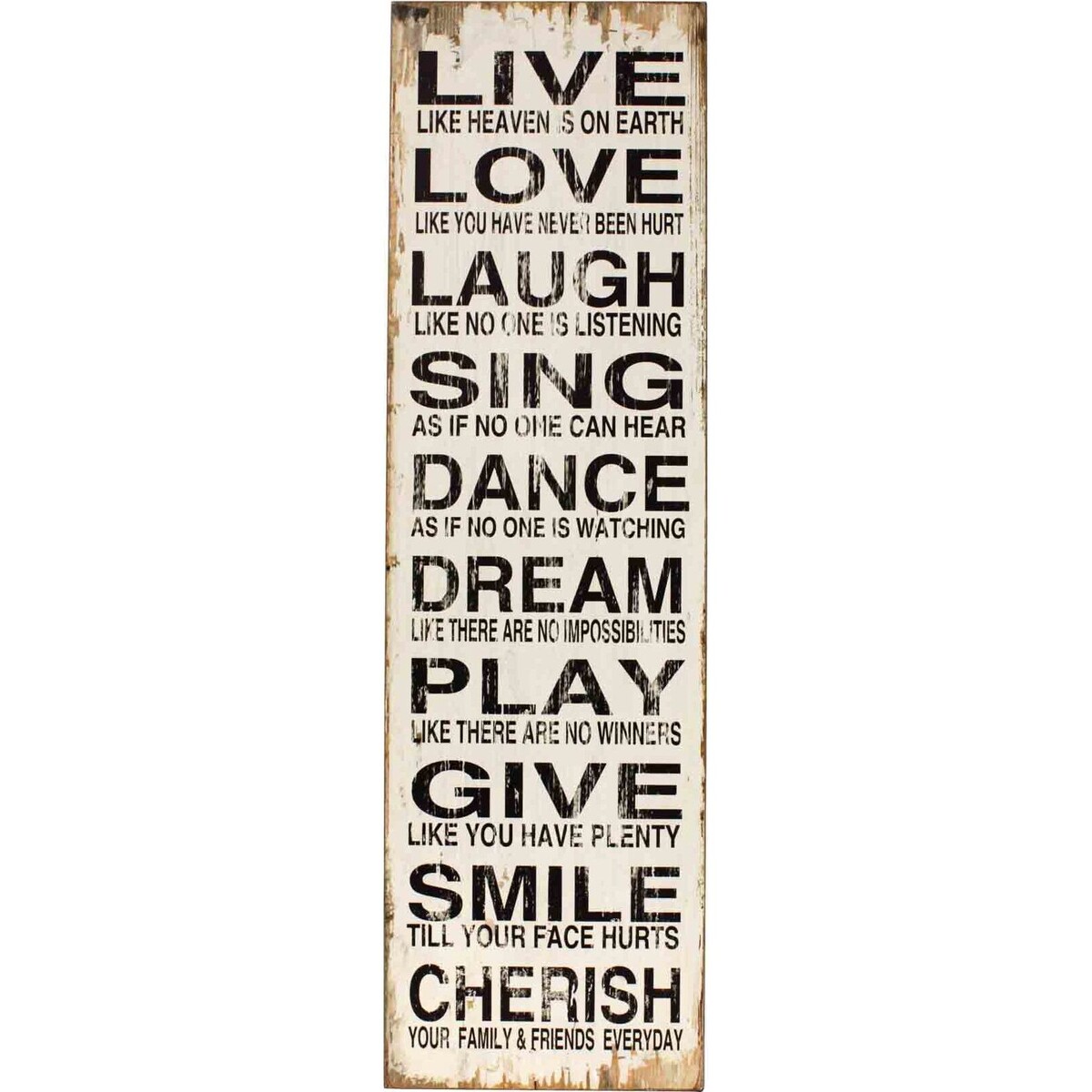 This artistic yet simple accent is a must have for homes and personal spaces. It could also boost the spirits and morale of readers in various other venues and places. For unique and practical gift ideas, this signage is a real winner. The long and rectangular shaped Sign Whitewash Live features bold letters and fonts showcasing inspirational lines and adage. The vintage themed signage is featured with the white neutral background. To stay true to its outdated look, there are brown accents and stained effects at the edges or borders. This inspirational sign highlights the texts LIVE LIKE HEAVEN IS ON EARTH, LOVE LIKE YOU HAVE NEVER BEEN HURT, LAUGH LIKE NO ONE IS LISTENING, SING AS IF NO ONE CAN HEAR, DANCE AS IF NO ONE IS WATCHING and so on.
