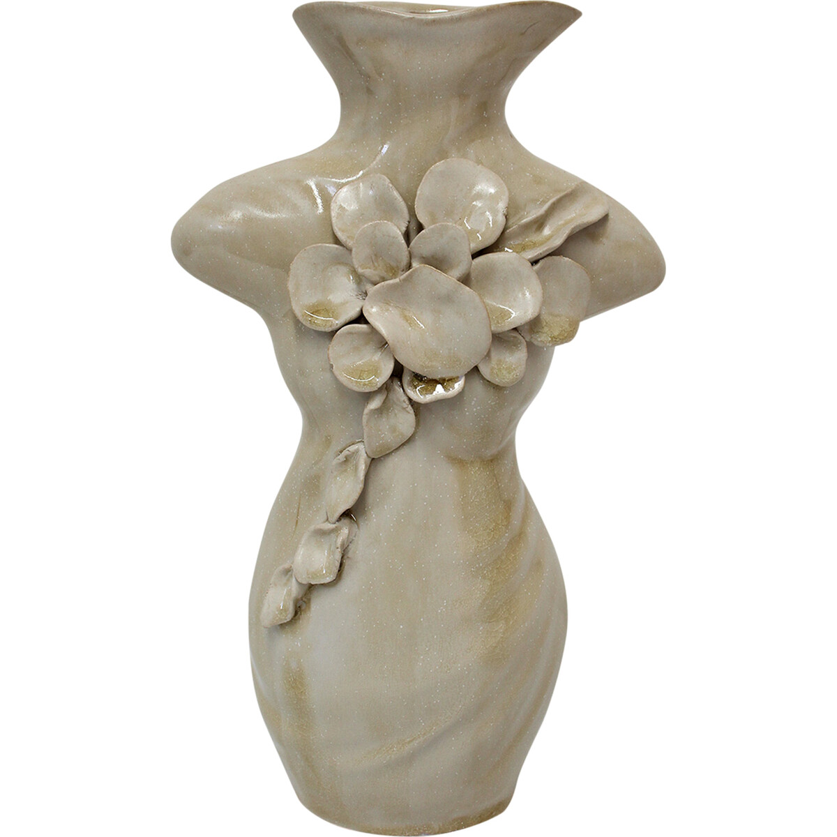 Curved petitely, this figurine style vase is crafted from very fine quality ceramic that wears a lovely sheen that speaks of its wonderful crafting. The front of the vase is adorned with ceramic flowers and petals that add to its textured beauty. The delicate neutral colour makes it all the more attractive and versatile in synching in perfect with any kind of décor. The smooth vase will look especially fine when dinned with a rush if colours and fragrance which the flowers are going to bring with them.