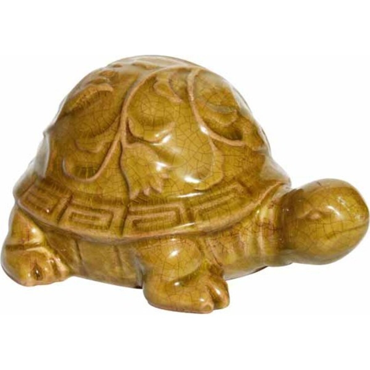 One of the most interesting things about this would be the intricate details on the shell. It features tulip-like flowers and leaves attached to long stems that run criss-cross with each other, from one end of the shell to the other. There are simple, Aztec-like square markings on the edge of the shell. The rest of its body - the supposed softer flesh under the shell and its thick feet - are pretty much like the real thing in terms of form and figure. The small protruding head has sharp, slanted eyes and an almost contented tilt for a grin. The ochre shade and the porcelain sheen all over the decorative piece make this shiny ceramic Single Turtle a great gift for people who love the cultural significance of this gentle, hard working creature.