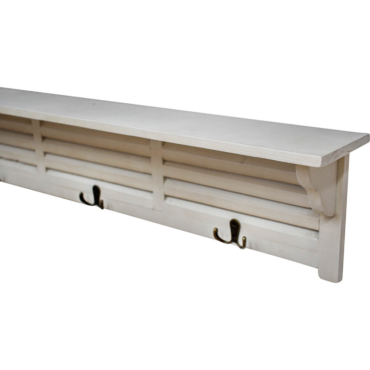 The Slatted Triple Hooks w/ Shelf is a wooden shelf made from 100% natural wood with 3 strong metallic hooks. It features three shapely metallic hooks which are black gloss paint and with each positioned in each of the slatted partitions. On the top of these partitioned slats is a smooth, 91 centimetre long wooden slab that is functional as a shelf for various options of displaying items or simply storing them. Customers can have this vertical space storage device nailed to their porch's wall, hallway, living room, bedroom, guestroom, kitchen and even bathroom.
