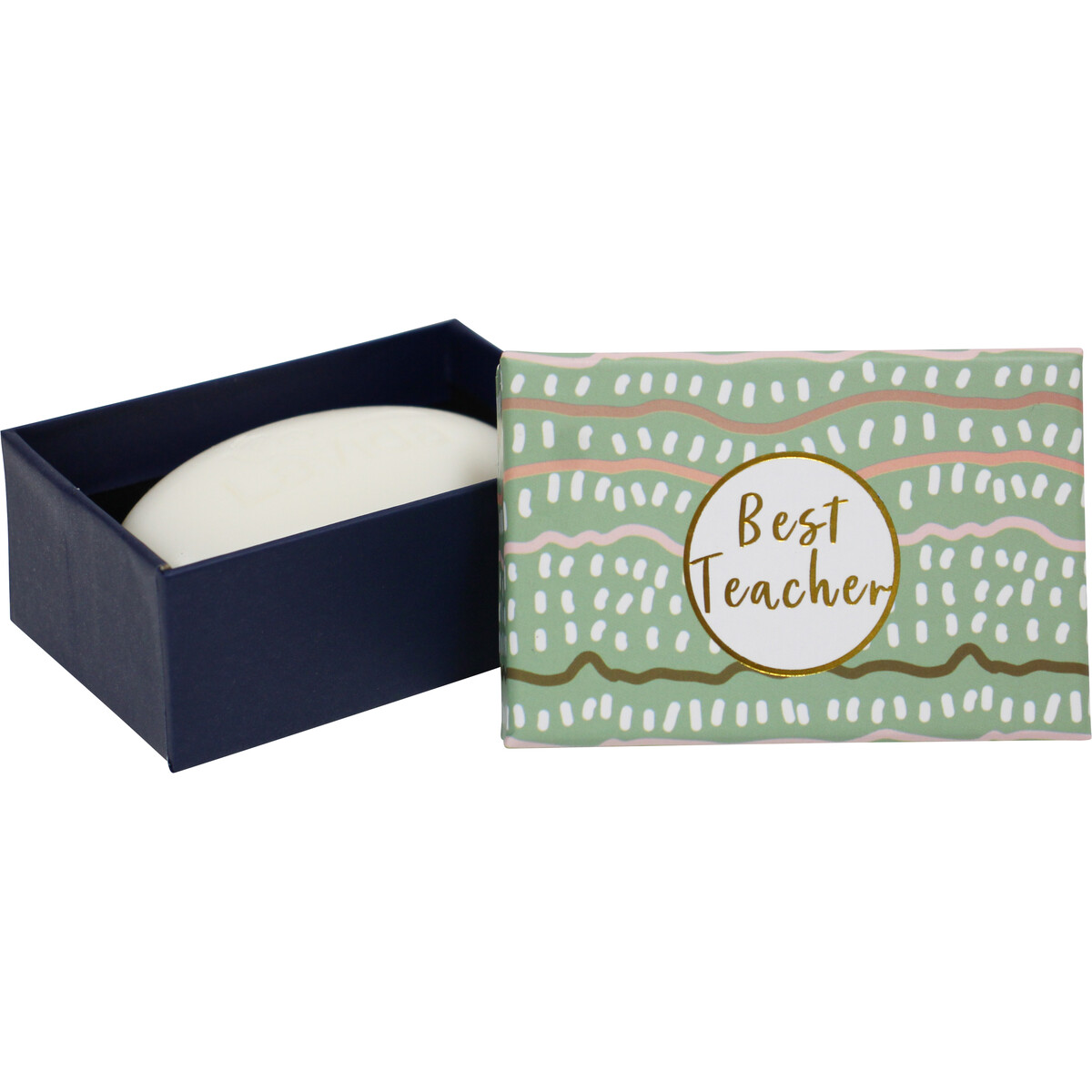 Soap Best Teacher Art is one of those gifts that just makes you smile. For a lot of customers, gift giving for teachers can be a bit tricky, but this beautiful soap is such a simple way to say thank you. We’ve made sure it’s both practical and unique, with a design that says ‘Best Teacher’ right on the front - makes it personal, so it feels like it was picked out especially for their child’s favourite teacher. It also has a soft botanical fragrance that we find is so welcoming but not overpowering - well-suited to calm any teacher after a long day at school. And you might notice, there’s an added touch of vitamin E and almond oil in the ingredients for extra hydration (and we know most teachers love that since they’re always washing hands!). The box itself comes with a unique pastel print so it’ll fit right in with home or classroom decor, and the soap is a standard 9x6x4cm block size. Comes ready packaged in cardboard so retailers don’t have to do much display or set up either.