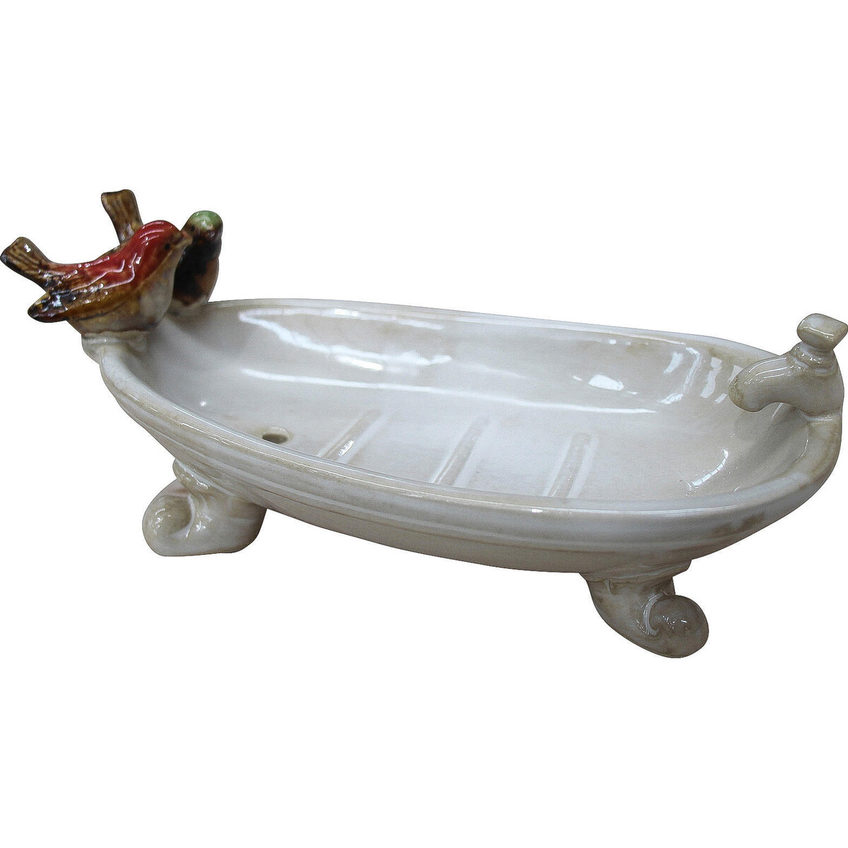 This beautifully designed white dish is made from ceramic with a handsome glaze for accenting a range of complementary colours in your bathroom. In the shape of a miniature bathtub, it features a cute small water tap on one end and two birds huddled together at the other end for a lovely romantic touch! With a French-inspired claw-foot bottom, this soap dish will look cute in a French country bathroom or in a guest bathroom with small decorative soaps or potpourri.