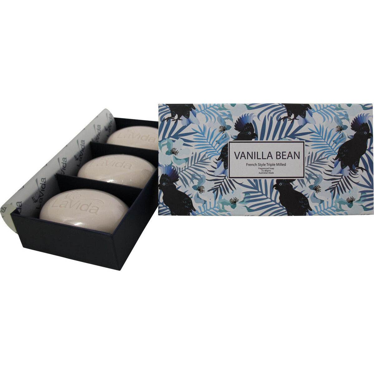 Indulge in the sweet, enticing fragrance of LaVida's gorgeous vanilla bean soap pack that is guaranteed to help your customers bathe in style. Providing you with three bars of soap, this pack has a print of Australian cockatoos in their natural forest habitat in tones of blue and black and is perfect to give as a host/hostess gift, Birthday gift or just to show someone you are thinking of them.