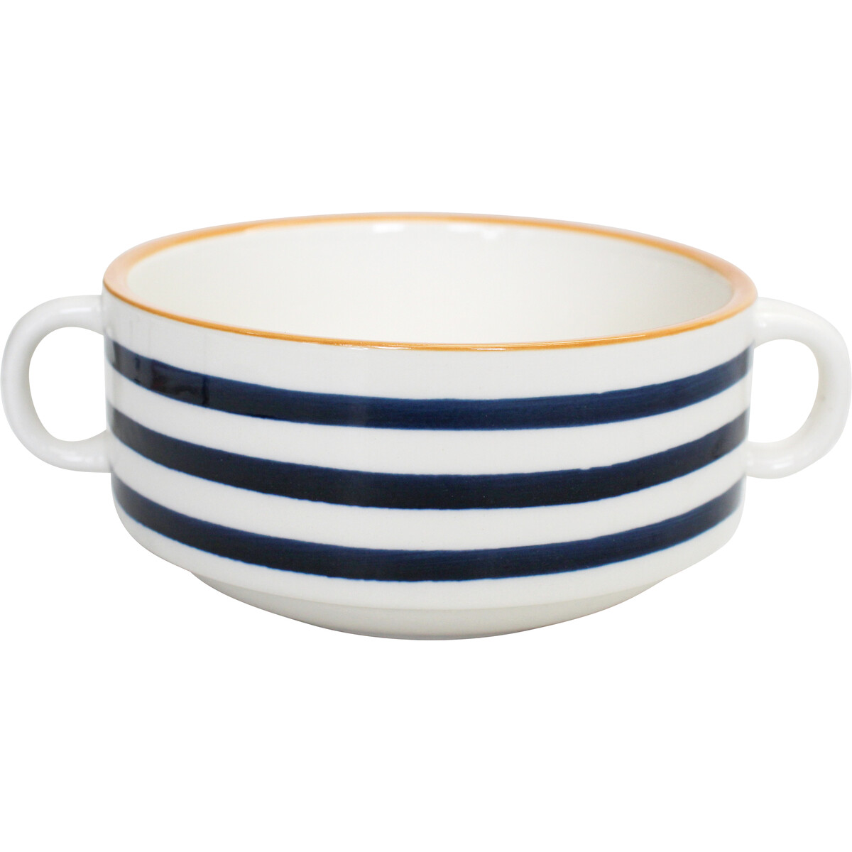 Discover the charm and functionality of the Soup Mug Stripe, a delightful addition to any home or office. Expertly handcrafted, this ceramic mug boasts a nautical stripe design that lends a touch of coastal elegance to your dining experience. With dimensions of 16.5x12x6cm, it's the perfect size for enjoying your favourite soups, stews, or even a generous serving of coffee or hot chocolate.