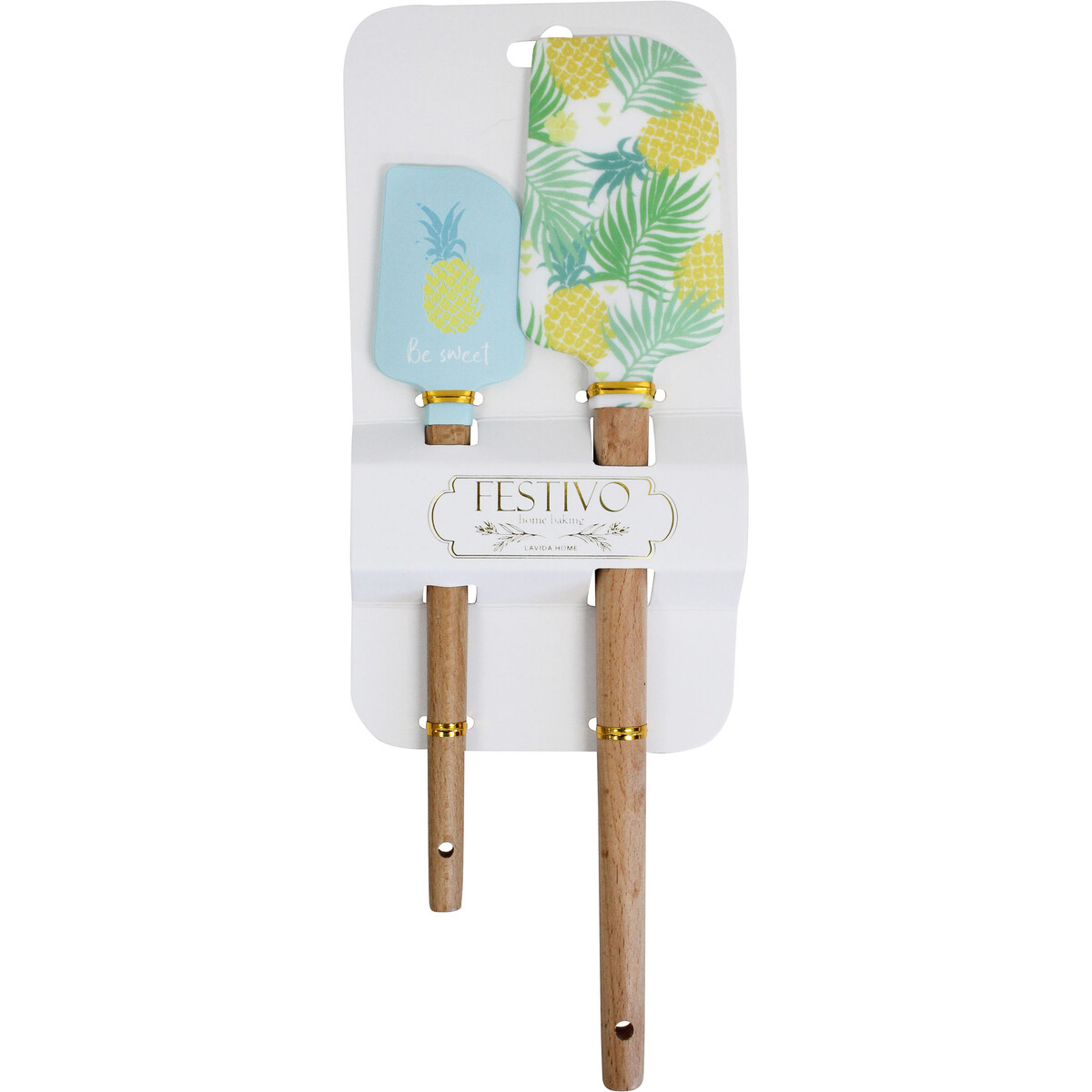Crafted from high-grade 'silicone', these spatulas boast durability and an easy-to-clean surface, which means handling sticky or tough mixtures is hassle-free. The elegant wooden handles add a touch of rustic charm, while the silicone heads are adorned with a fresh pineapple design that injects a tropical flair into any cooking or baking experience.