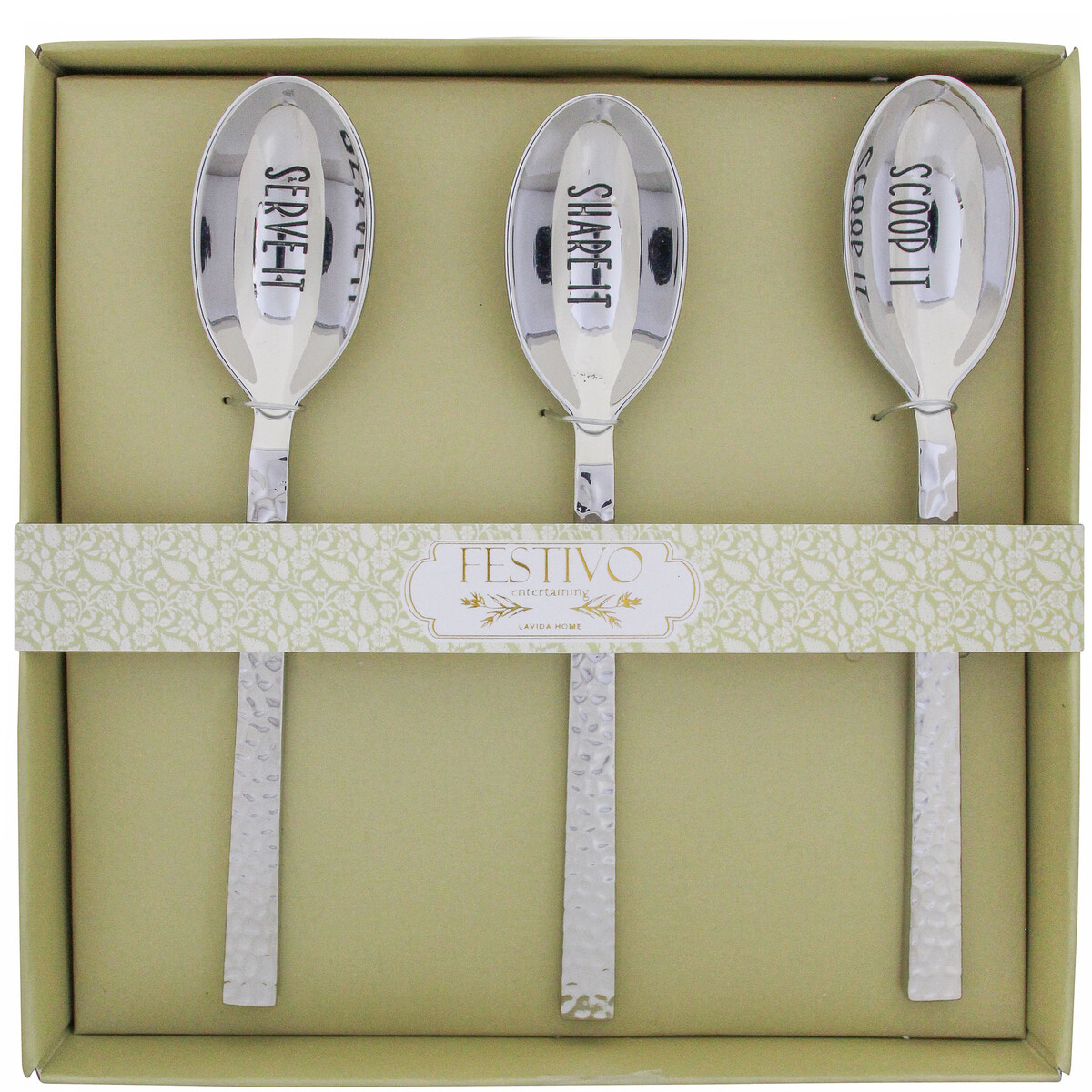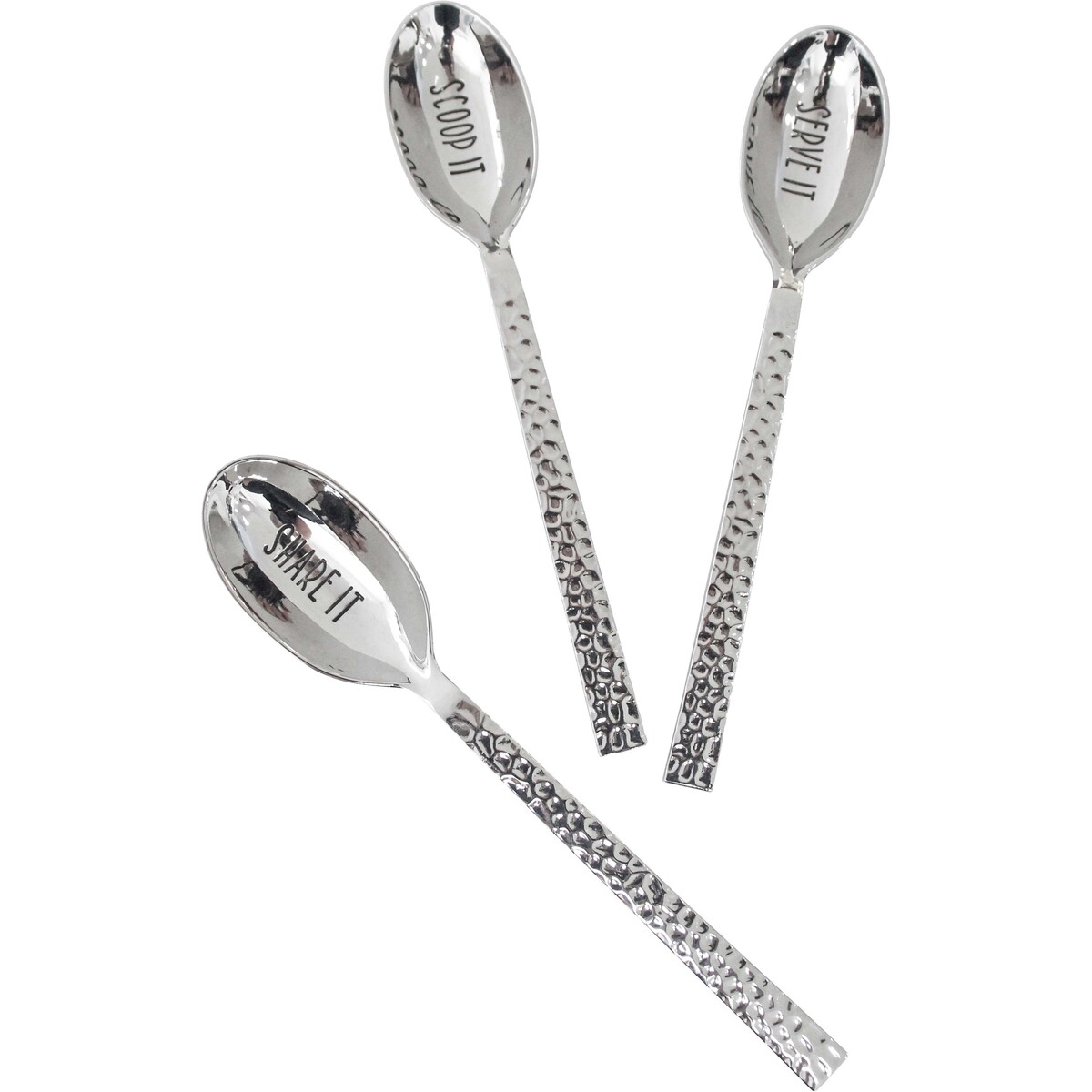 This 3 piece Spoon set is a great addition to your collection. The biggest drawcard is the hammered silver finish - very much on-trend but also classic enough to last past any season and complement different themes. We also think the Serve It, Share It, and Scoop It stamps give it a playful air while remaining classy. The 17cm length fits comfortably in most hands, but there is enough surface area to pick up a healthy serving.