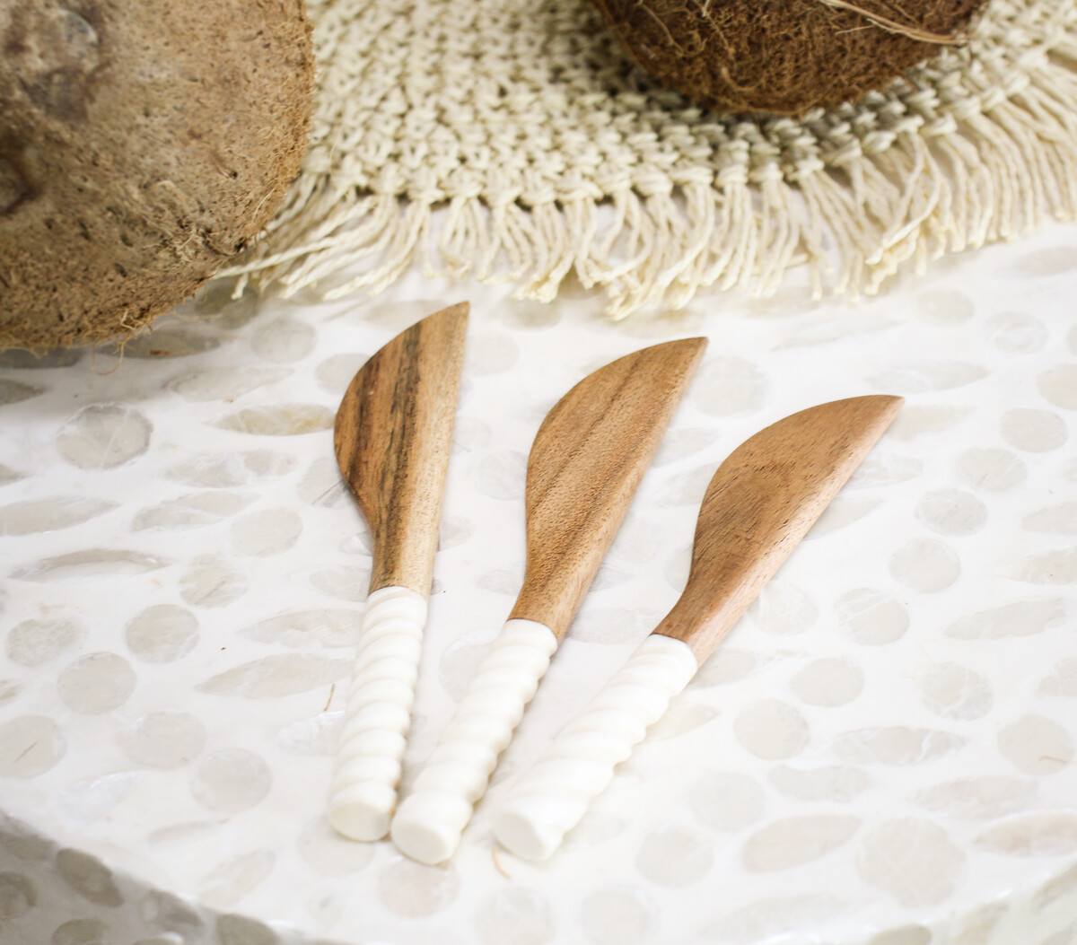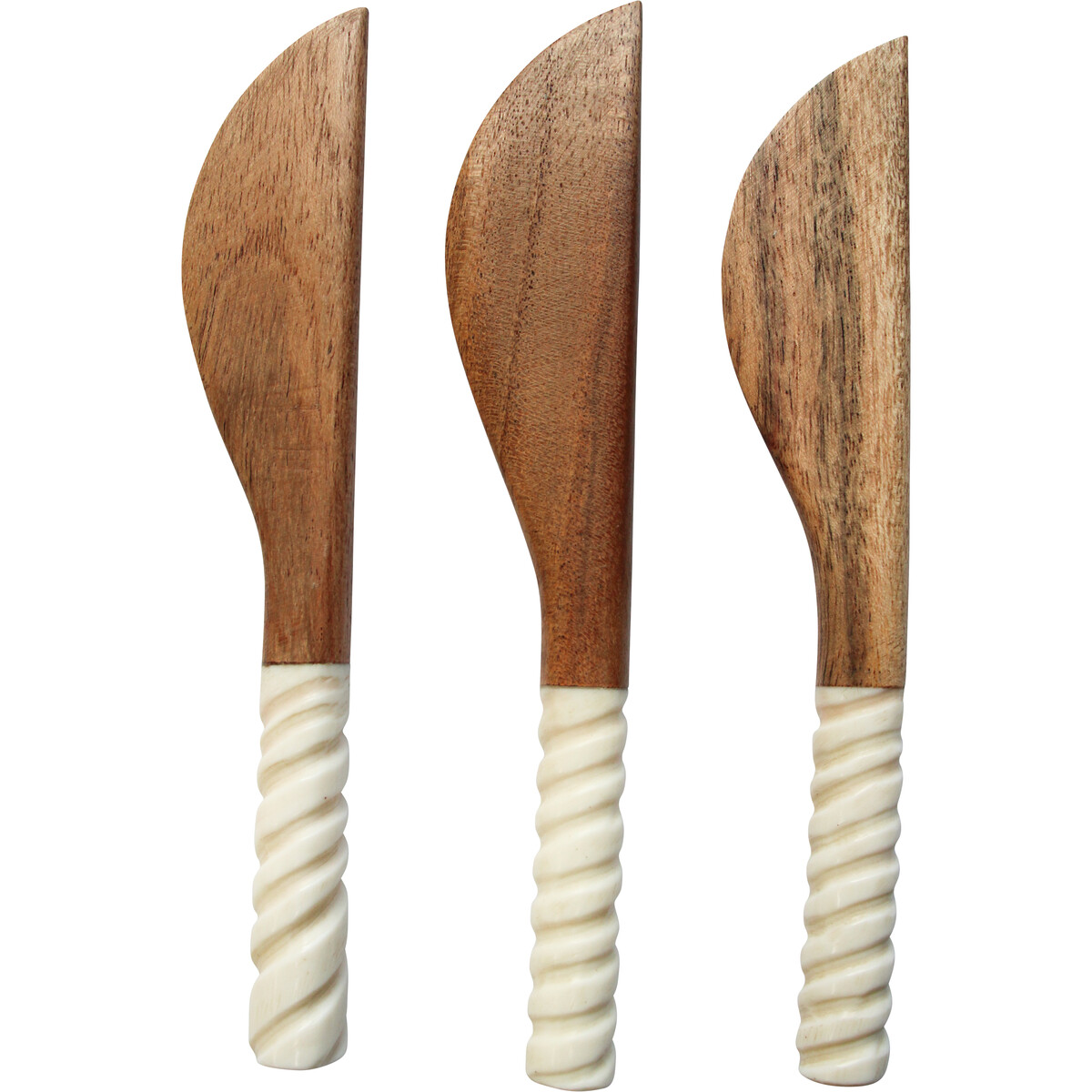 With all three spreaders having a handle which is ornately crafted in a spiral design before being hued in immaculate white colour, this Spreader Tanzania S/3 would certainly appeal to the ornamental sensibilities as well as spreader functionality of your customers. The base or handles are made in a spiral shaped design using top grade resin material while the spreader part is made in the shape and likeness of Tanzanian spreaders using all natural, environmentally friendly wooden material. It measures a total of 14 centimetres in length.