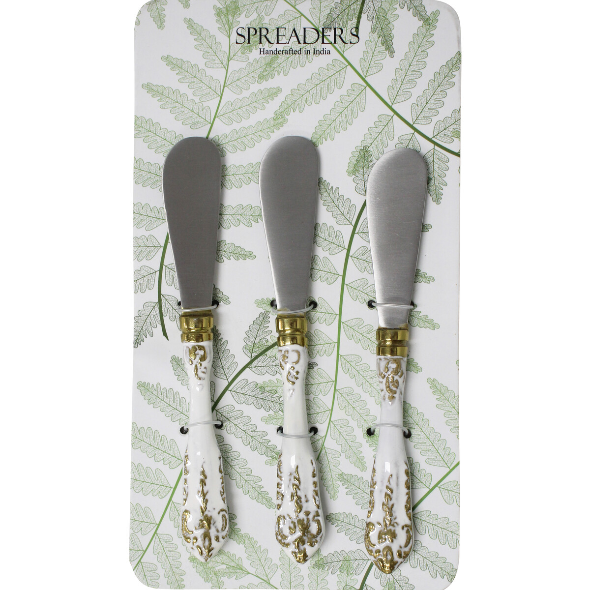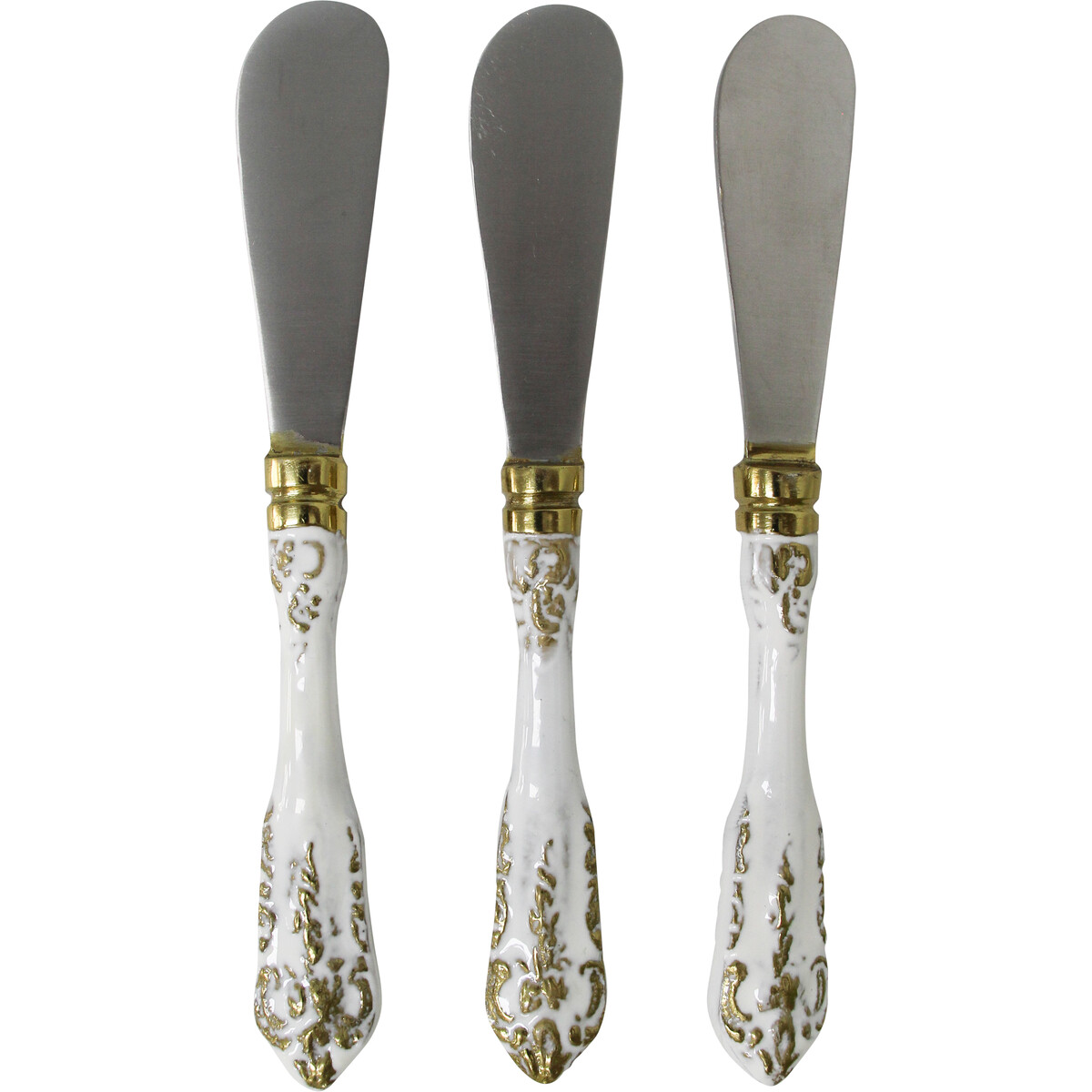 Bright and beautiful, the Spreader Vintage S/3 would easily charm its way into the hearts of your customers as it is made in a design which is fashionably chic as well as practically functional. Artfully made through the use of premium quality stainless steel material and high grade aluminium, the ergonomic handle is glazed in a beautiful white colour and then decoratively patterned with gold coloured accents. This adorably crafted handle leads to a flattened end which would be highly functional for use in spreading various food items such as cheese, butter, etc.
