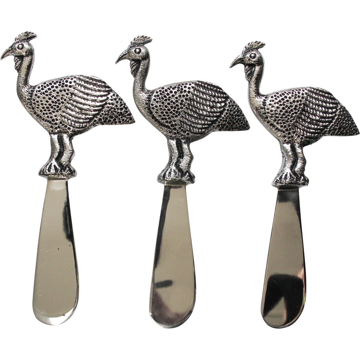 Guinea fowls are pretty and lovely birds. Though they are mostly domesticated across our country, several of these birds roam the lands of several African countries as wild birds. What makes these bird popular choices as a domestic bird is their value as good sources of meat, eggs, and every ornamentation given their colourful feathers. It is this same bird that influenced the alluring design of this Spreaders Guinea Fowl S/3. While the brass made ergonomic handle is crafted in the shape and motif of guinea fowls, the flat blade is made using steel material.