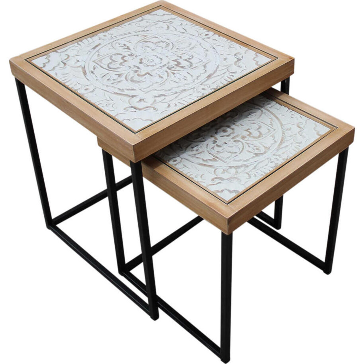 Inspired by industrial aesthetics, the tables come complete with symmetric metal legs and the clean lines on this nest of tables give an old world charm, all while still looking on trend and relevant in a modern property. They are traditionally fashioned and each square shaped table is manufactured with a combination of timber and metal with beautiful resin patterns that are covered by a glass inlay adding a contemporary twist to this wonderful nest. It is recommended to use coasters or placemats to help prevent marks or stains and you may wipe the tables clean with a soft, dry cloth after each use.
