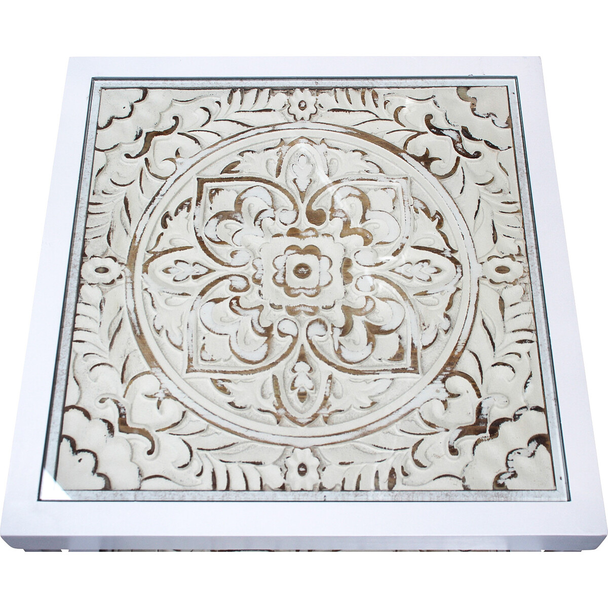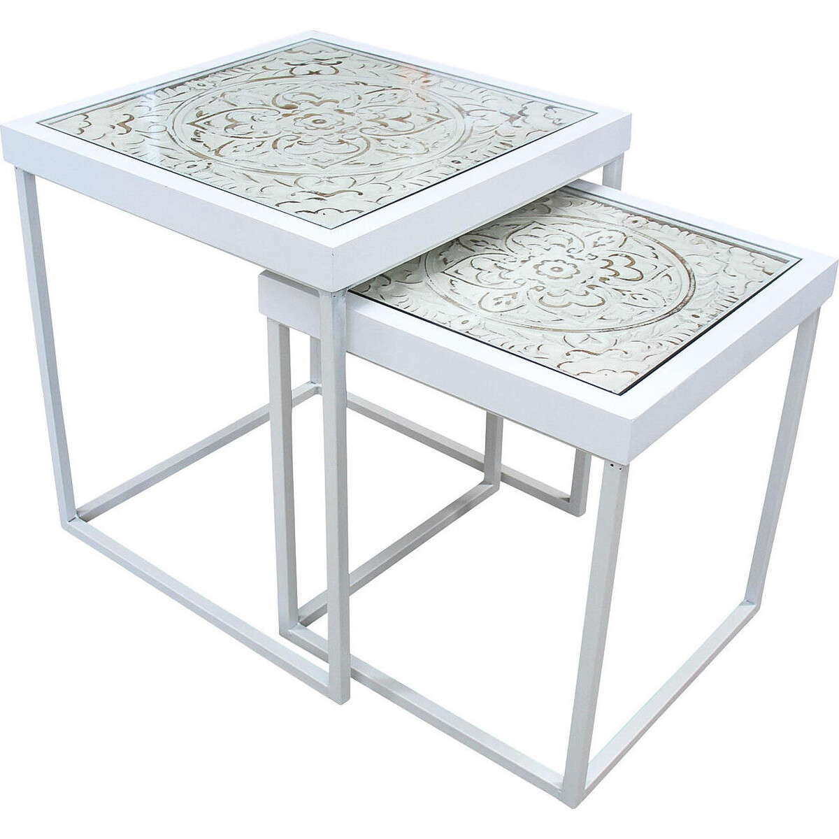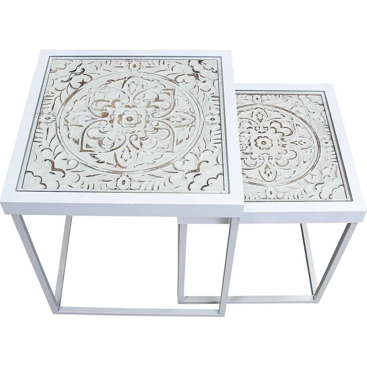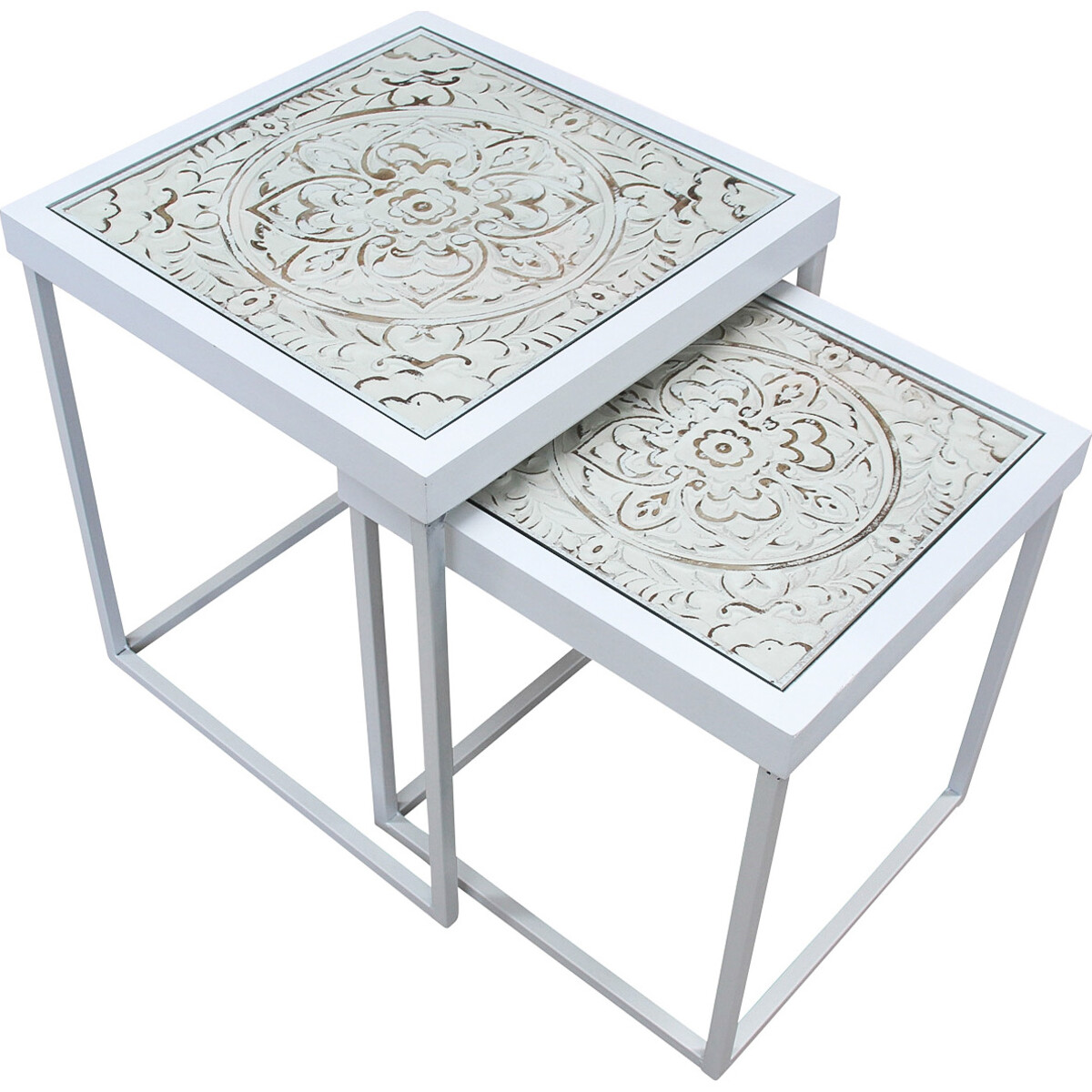Made from a combination of material such as resin, timber, glass and metal-the table come in a square shape with metal frame painted in white and the glass covered top holding within stunning looking traditional design on resin embedded under the glass. Despite the very ornate look of the design, the rest of the piece is sturdy and elegantly simple. Place it in your living room space and pull them out as and when you require to sue the smaller one which will nest underneath the larger table. After all, when seating needs t be extended and you need that little extra table top for a display or a lamp or for keeping the book you are reading or the coffee you are drinking-such tables come in real handy. Worked in details add a stunning kind of charm and its white colour will settle well into all kinds of pre existing style of décor. The glass to makes sure that your table look shiny clean at all times.