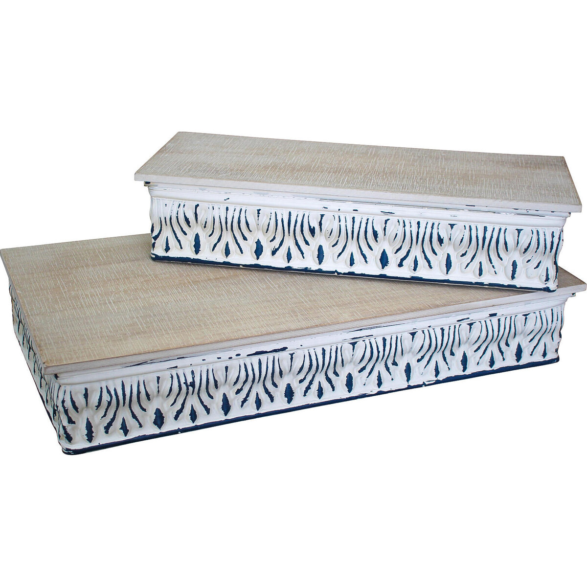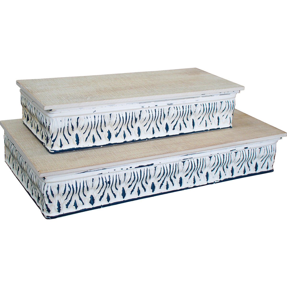 These stands have a simple yet bright pattern in dark colour over a white background at the base which will match any colour scheme easily and the top wooden surface adds a nice rustic touch to its overall look. The base is constructed from solid iron for a stable and durable style while the top surface is made of medium-density fibreboard. These are great to place on the floor, shelf and tabletops or out in the garden to hold plant pots, planters and room accents like ornaments, vase, collectibles, books and other knick-knacks for both storage and display purposes.