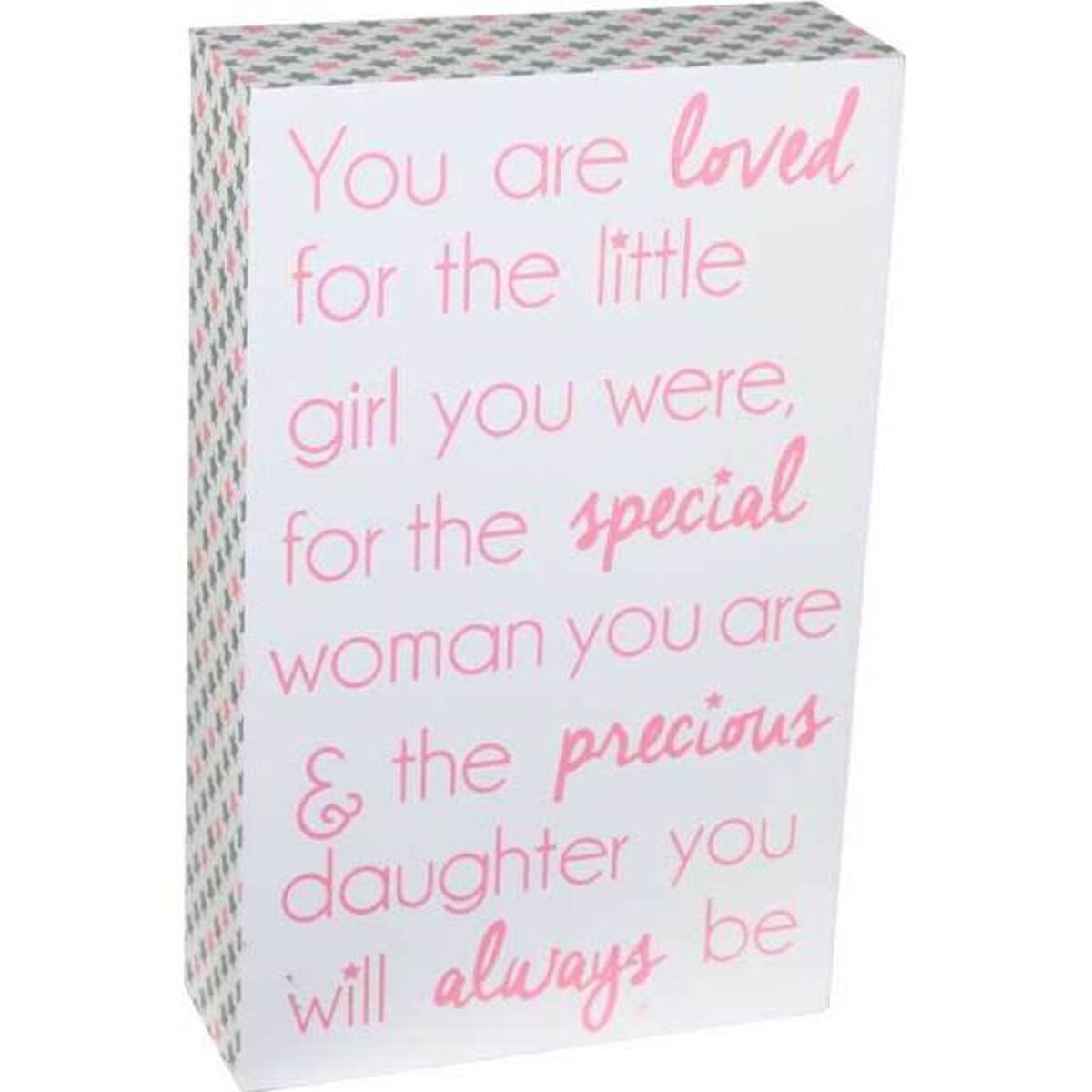 You heart fills up with pride each time you see the little girl you had become such a fabulous lady and the urge to express the pride and the joy of having someone so wonderful as your child has always been there in your heart. Expressing it with words sometimes sounds way too difficult, yet here are simple enough ways to help you get through this hesitation. This lovely 20 cm high and 13 cm wide freestanding sign board will help say those words in the most artistic of ways trough this well designed piece. Gift it this year to the child who has made you happy over the years. The words - loved, special and precious have been highlighted with bold lettering communication exactly how you feel within. Any daughter would feel proud to display this precious gift from the people whom she holds as her reason for being there - her parents.