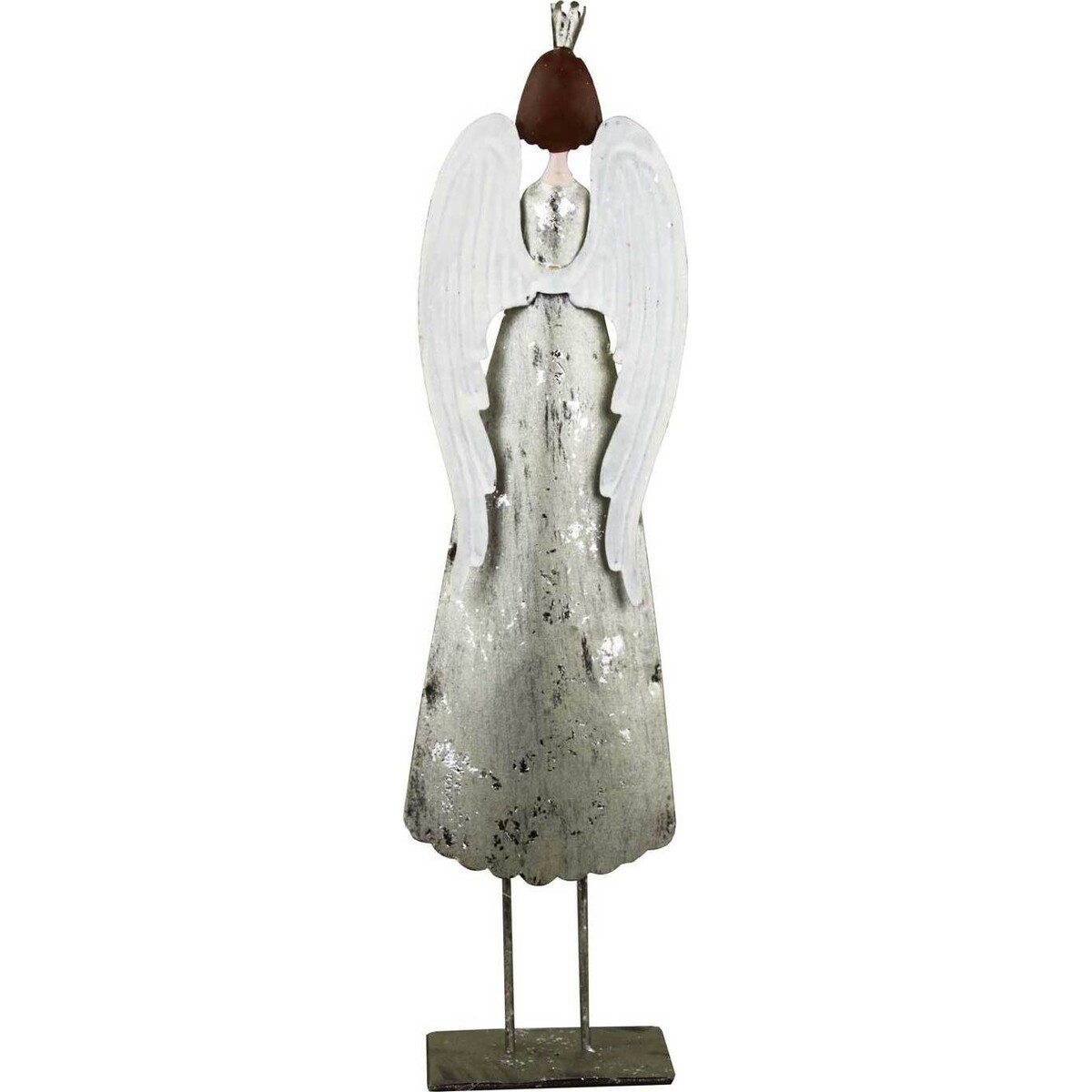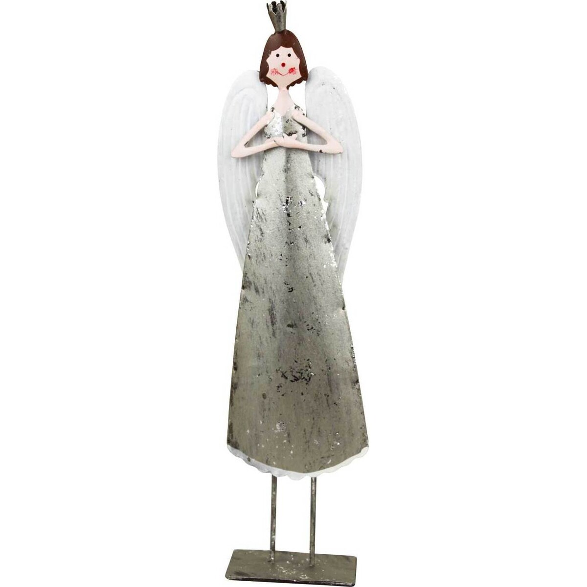 The season of thanksgiving is a great time to make some major changes in your decor - as this would be the time to welcome family and friends and what better way to welcome them than by pretty little symbols of Christmas including this metal crafted angel . She is made of metal , stands 31 cm tall and is dressed in white gown again created by simply washing the metal is white paint - shabbily. The angel wings in w faint pink, her cherubic sweet face with their rosy dots and her brown hair are all hard to miss details that make her all the more endearing. It is her presence that makes up the best good luck charm for your home. She holds her hands close to her heart as if sending her best wishes your way. Placed on mantles or bookshelves, she will be noticed for so many different reasons. She is up on a metal stand that appear like her legs, making her stable and easy to place on tables or any kind of flat surfaces.