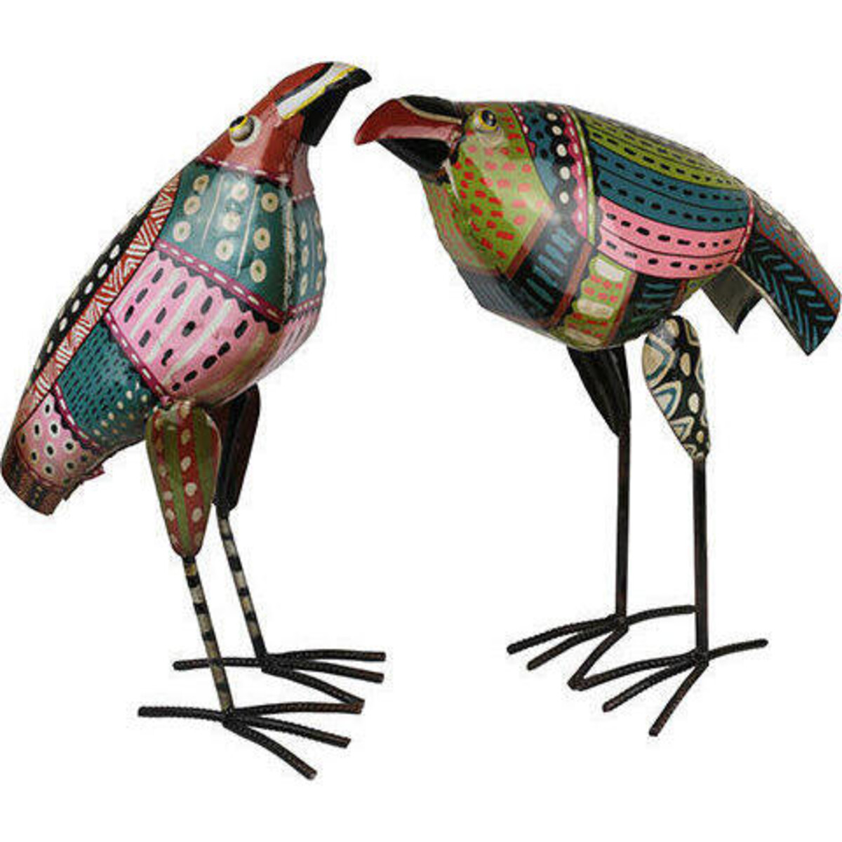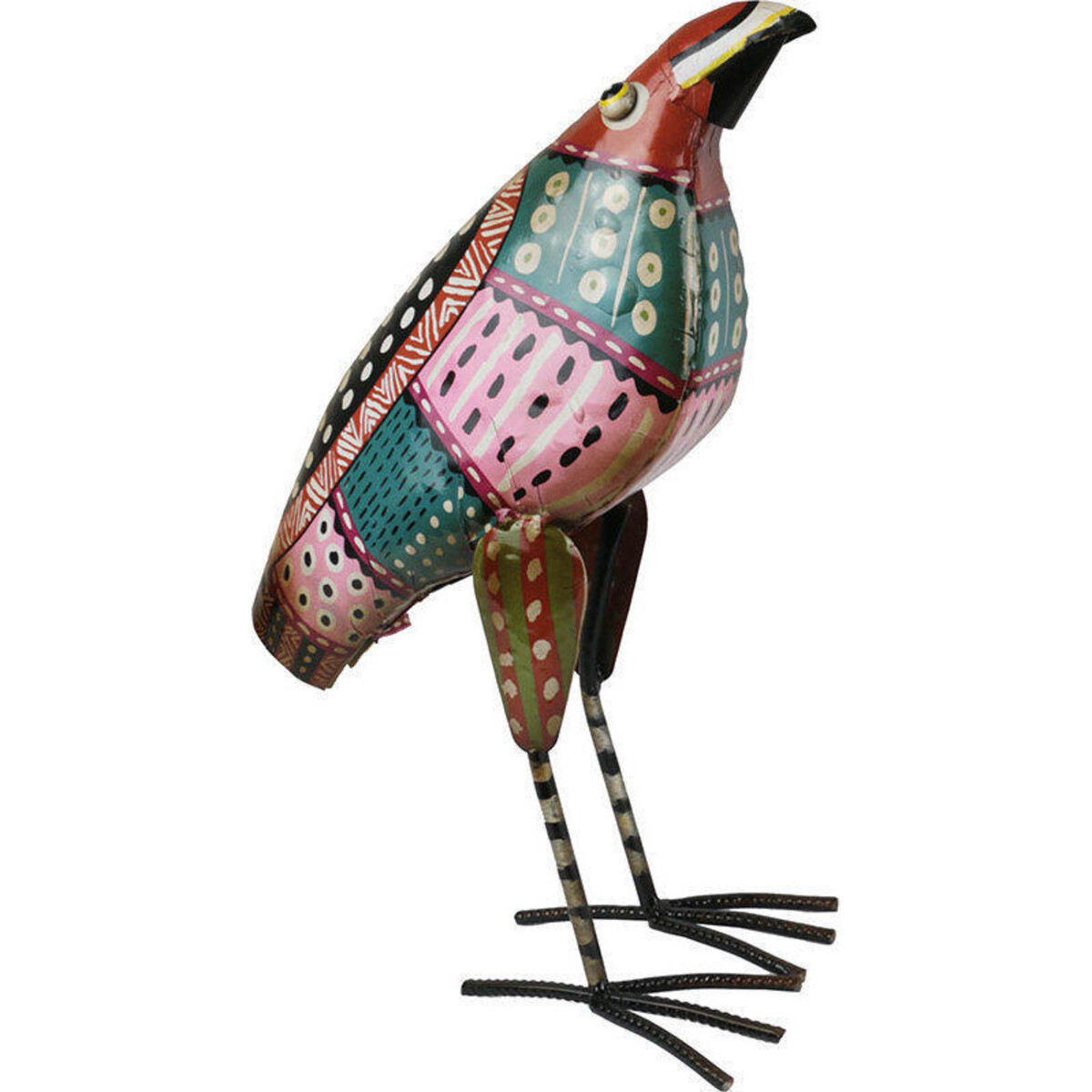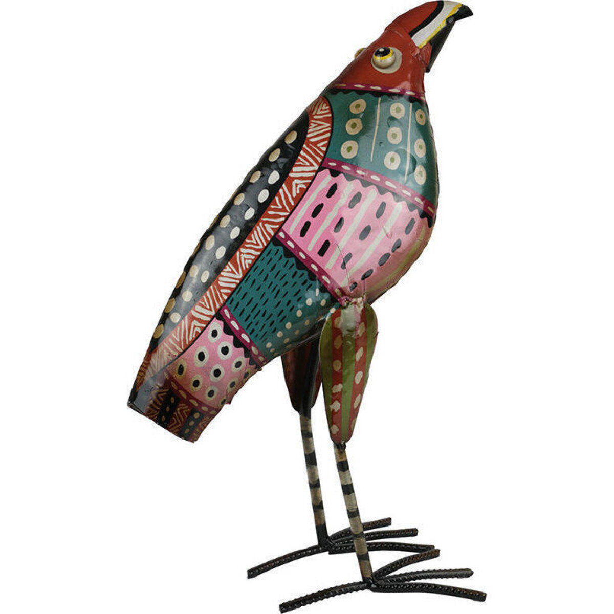 Make a whole new difference to the way your décor looks with the inclusion of art piece created with an eye as much of folk art as on contemporary appeal. Here is a bird fabricated by clever handling of metal sheets that have been shaped into a large bird - the head queerly like that of a toucan - the strong bill giving the tell - tale look away - and the colourful body so much like birds of the tropics. This piece can stand on its thin long legs, the torso created from sheets of metal painted in myriad colours and designs that somehow seem to come together though nothing like it really exist in nature. However, the very tribal feel of the bird is so strongly evident. The deep earthy colours in browns and natural indigo, the spiral designs and dots roughly painted, and the robust nature of its form - all indicate a revival of a very old style of rural craft. A piece that could stand in the corner perhaps with some foliage plants and make an impression quite its own. Would also looks as great in the outdoors, perhaps in the patio or the garden itself. Stands quite firmly balanced on its legs and wide feet which too have been fabricated from metal. A great means to compliment your wildlife or nature themed home where a burst of colours and energy would be welcome.
