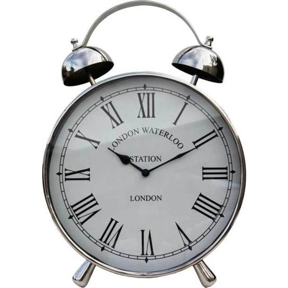 This standing clock is the epitome of classical, traditional and conventional design. This classic alarm clock looks much more interesting and it's certainly much more effective than its digital counterparts. This clock has a simple white clock face that is ringed in dignified black roman numerals. The words ?London Waterloo Station, London? follow the curvature of the clock. The body of the clock is silver polished to a near reflective shine. The look of this traditional and classic clock is completed with a twin set of ringers that will no doubt give off a loud ring at the correct time. Although this kind of loud wake-up call is not for everyone it's certainly designed to get you up and out of bed quickly. This clock will catch the light in any room and glow. This classic standing clock is a great little product that will be sure to be very popular with customers of all ages.