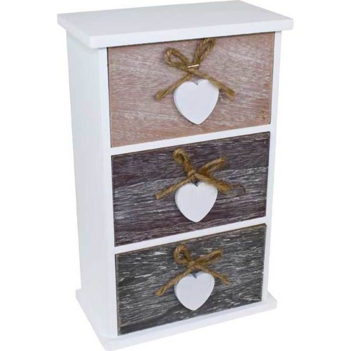 Standing Drawers Bow Heart measures 16x26x9 cm and comprises of a chest of three drawers made using wood and MDF material. The knobs for opening are white and shaped in form of hearts. A string is tied directly atop each one that provides good contrast with the overall wooden framework lying behind. One may purchase this product for use within the study room, living room and other suitable locations of the home. Library operators can also get several of them for storing books, documents, stationery and other apparatus. The wood used is painted using faint colour - tones that make this product suitable for use in diverse settings.