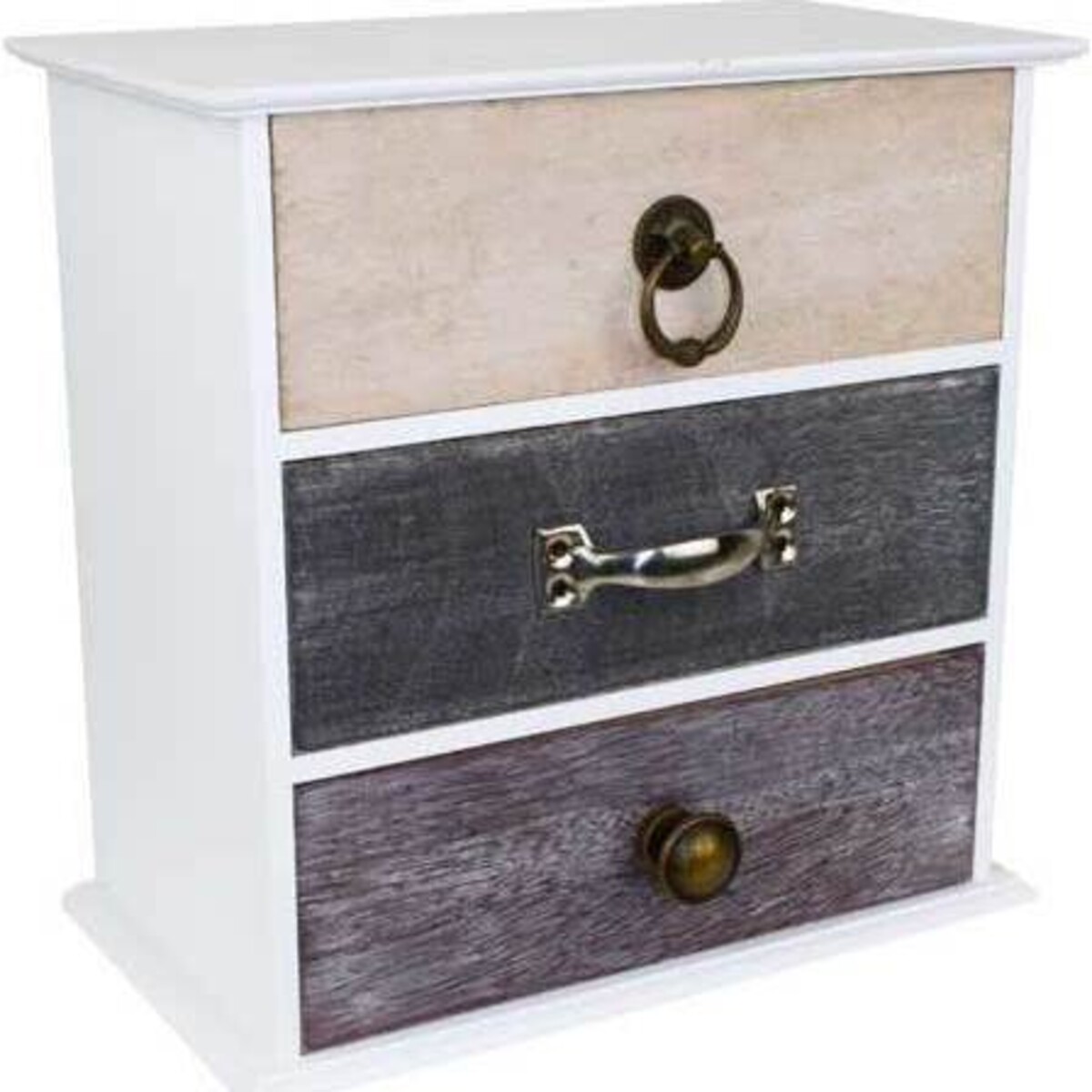 Standing Drawers Variant Small is 23x24x13 cm in size. It features a chest comprising three drawers made of wood. The opening knobs used are individually - distinct and metallic in design. This imparts a characteristic asymmetry that exhibits eccentric artistic sense. The top drawer features a ringed knob, the middle one a handle knob and bottom one a round knob. Two drawers are coloured in relatively dull tones, with the top one having very faint form of pink. Office operators and homeowners alike may buy this product for customized applications relating to their unique settings. One may take advantage of the apparent disparity of presentation which this product depicts to emphasize various interior aspects of decor within a bedroom, study room or other location.