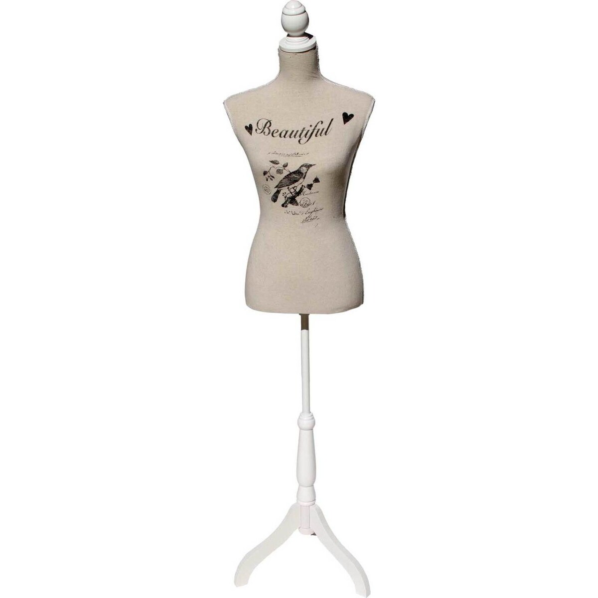 This standing model is tan in colour and features the design of a bird sitting on a branch, hearts, and the word "Beautiful" written in elegant script right on the body. The stand, which is white in colour, accents it perfectly. This stand is lovely to display as is, but is also ideal to use to show off your own creations or to use as a hanger for your next day's outfit. With this many uses, how can you go wrong? It's sure to be your new favourite fashionable piece to add to your home.