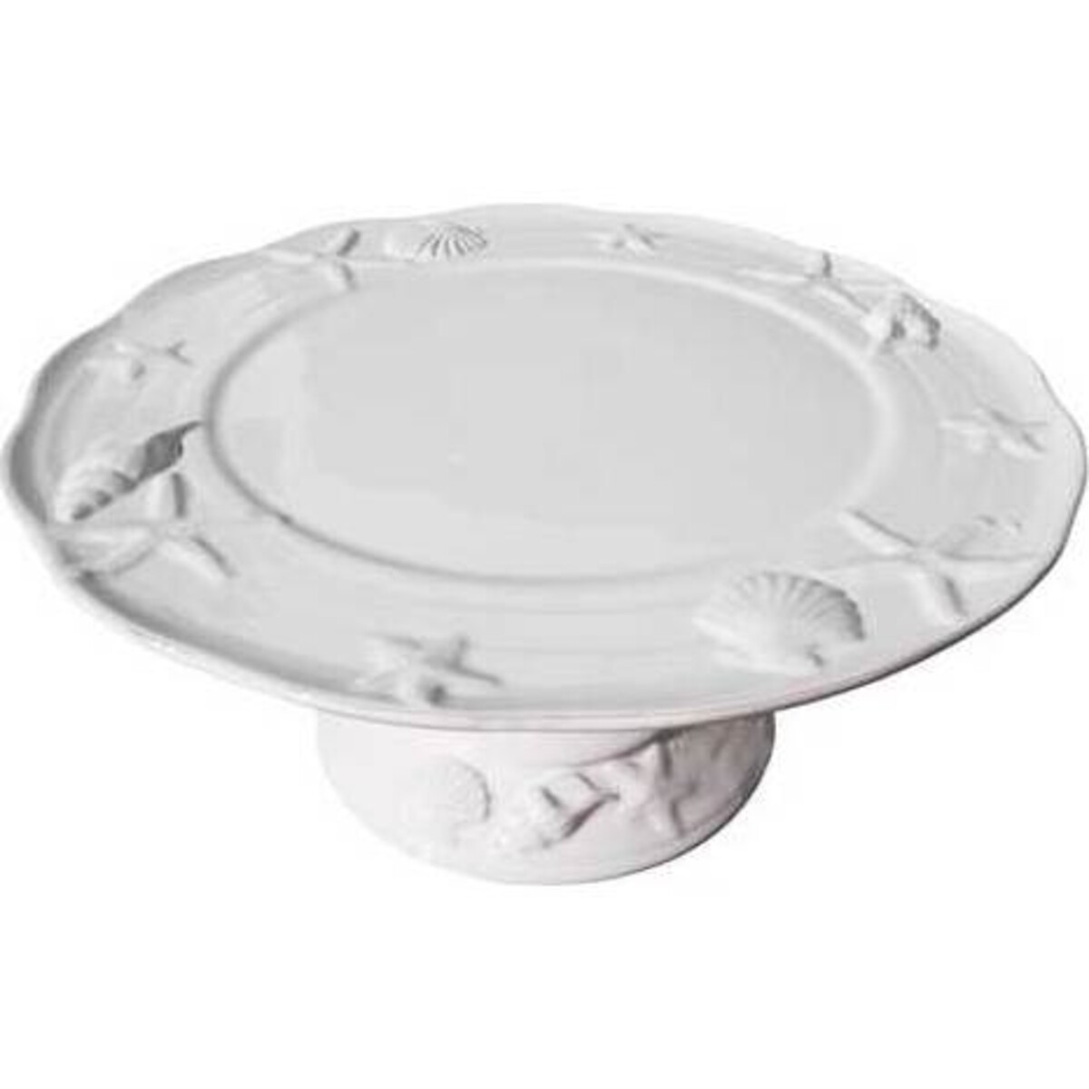 • Seashells and star fish in relief encircle the recessed center of the platter • A scalloped edge along the outside adds fun frilly movement to the seashell pattern • The pedestal bears the same seashell and starfish design For restaurants, it's an entertaining way to display baked goods, desserts, candies, or fruit. It's made from durable white glazed porcelain and stands on a pedestal that shows off the amusing design. Great for bakery display cases for muffins, cream puffs, cookies, tarts, and finger size pastries. Use it in a glass front cooler to display cakes or on a counter top for bagels, rolls, muffins, and pie. Stores can display the Oceano standing platter with the Oceano canister, or combine them both with other white table ware. Use coloured table clothes and linens to complete your visual display.