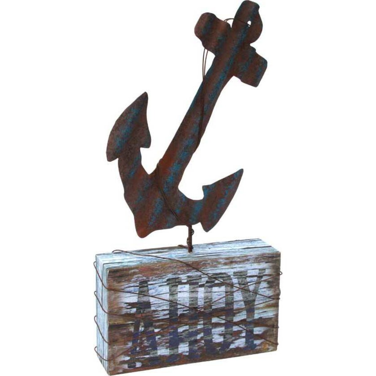 Sailboats, fisher folk, the smell of a fresh catch and boats coming home at sunset - waves and the sound of the gulls in their cacophony - all of this are images of the seaside that fills our senses. This beautifully created from metal and wood piece is truly dramatic in its symbolism. A perfect setting for it would be a bar or seaside restaurant, maybe even the room of anyone who cannot have enough of the sea. The metal anchor, all rusty and rough edged looks, as if it has been pulled out of the waters. The wooden block says - Ahoy - painted in white, barely visible yet still clear - a call that all those who love tales of the sea would love to hear it again - be it from Captain Haddock or the Pirates of the Caribbean. Would make a great add on to a boy's collectible of the sea, a lovely decor item as well to add on to at the bar or the counter of a seaside restaurant. It's impact with the rough wood and metal look would also look equally great outdoors.