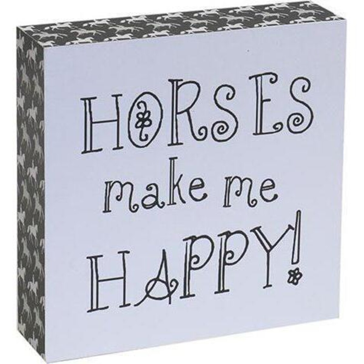 Why not wear your heart on your sleeve with this gorgeous little sign board that spells it out without mincing words? This lovely sign board says it straight from the heart that it is in the sound of a neigh that makes your day! Make this equestrian themed signboard apart of your home and lay all doubts to rest about what makes your happy. Create your own little corner with the help of more such signs that are freestanding, made from MDF, with lovely printing and bright colour effect to add a spot of cheer to your interiors. The words on this one simply says-Horses Make Me Happy- and quite clearly the love one holds deep in one's heart has simply spilled out in this one. The white face of the board hosts a lovely font whose lettering is quaintly informal. The sign being square has 12 cm dimensions and will easily balance on its side. A fresh look at how we can make simple declarations of love without much ado.