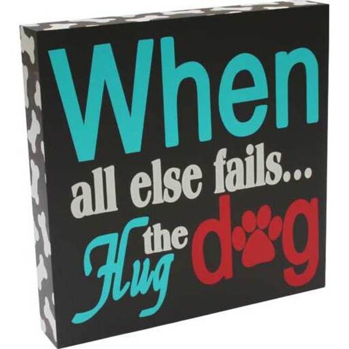 Standing signs are a great way to bring to notice elements in our life, by way of thoughts and suggestions which can change the way we act or react and this particular standing sign does just that. Only about 24cm in length and 24 cm in breadth, this wooden sign board may be placed on tables or any flat surfaces where it will catch everyone's attention. The breadth of the sign board is beautifully detailed with dog bone printed all over. The sign itself is covered in black paint and the lettering is in bright bold blue, white and red and it says - When all else fails - Hug the Dog - how true! Any pet owner would agree that if there were a stress buster that actually works, breathes and loves, - it can only a dog. This is a standing sign which will remind the pet lover of how precious a creature their pet is - a great gift and a wonderful way to add that certain bit of positivity to the decor. While the design may be very simple, its quality of finish, the manner in which tiny details like the paw prints and dog bones have been added on, all make it rather special.