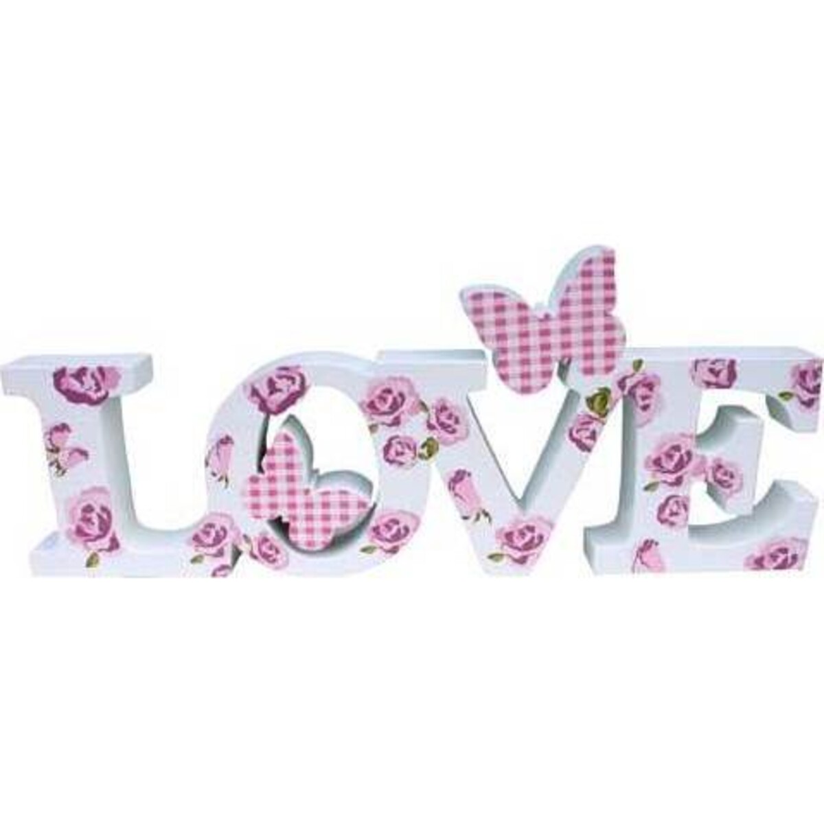 This gorgeous piece of art consists of white cutout letters that are connected and spell out the word "Love." The letters are embellished with lovely pink and green roses, as well as two white and pink plaid cutout butterflies. Whether you hang this piece up or stand it freely on a mantel, end table, or dresser, it's going to look beautiful. While the love sign is ideal to display for Valentine's Day, it's wonderful enough to put out all year round. Expect to receive a lot of compliments on it.
