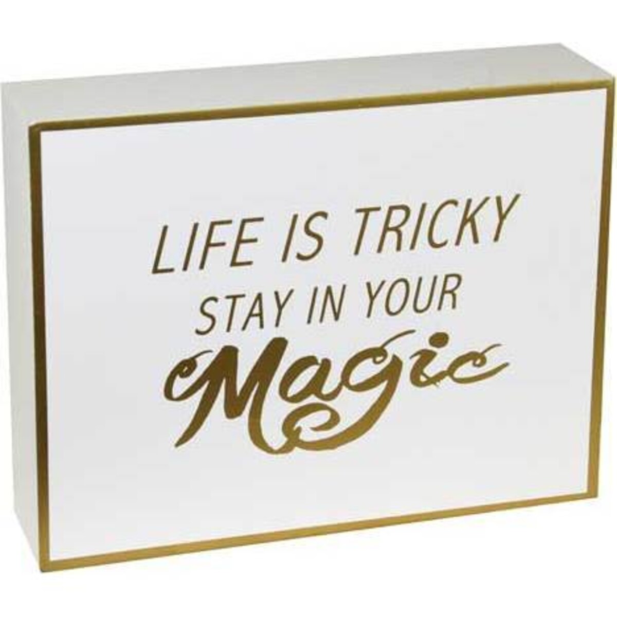Sure life is tricky and the solution to that need not be too difficult and easing that stress on how to deal with the challenges of everyday life is this sign board from Lavida that believes that the right kind of thinking can allow us to get over any difficult moment on our lives. Simple in its design, the mere seven words on the sign board makes all the difference to the way a situation can look to you - Life is Tricky - Stay in your Magic - a hope is instantly lit in your heart that - you have t in you - the magic of being who you are that will help you ward off any troublesome situation and deal with it. The simple white and gold design sign board is merely 15 cm high and 19 cm in width thereby making it compact enough to be placed in nay part of the home. It would in particular suit the children's room who are tackling the usual growing up pains. An inspirational al message that warms the heart and makes one feel so much more safe and secure.