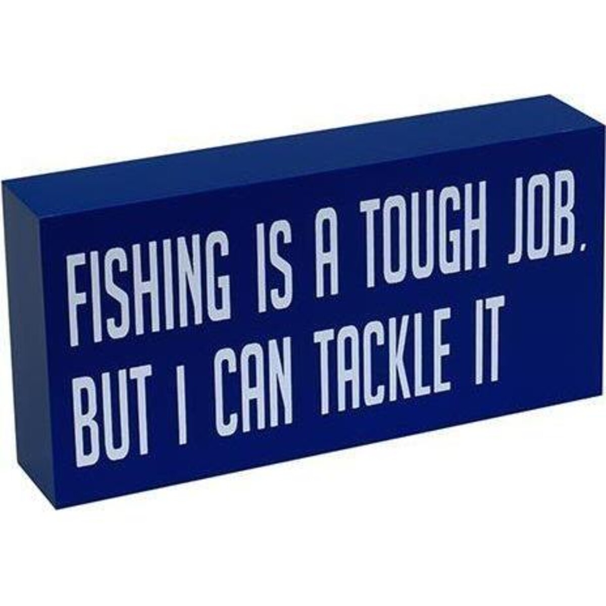 Here is the most audacious of puns that any angler could think of throwing at their doubters-Fishing Is a Tough Job but I can Tackle it-as if the world was ever convinced about the same. Giving anglers a free run to declare their love in the most unconventional of ways is this lovely sign board dedicated to the love of fishing - an art to many, a waste of time to a lot and an absolute an obsession for those who have been bitten by it. To make light of this truly amazing pastime that is as peaceful as it is challenging-is this quip on a sign board that should certainly put a s mile on the face of avid anglers as well as their detractors. Enhance your spaces with this sign board if your love for fishing is something you would like to declare boldly. All blue and vividly hued, the sign board is about 20 cm long and 10 cm high which makes it well designed to be sitting flat across tables, shelves or mantles with ease. Would make your personal spaces more cheerful and less formal.