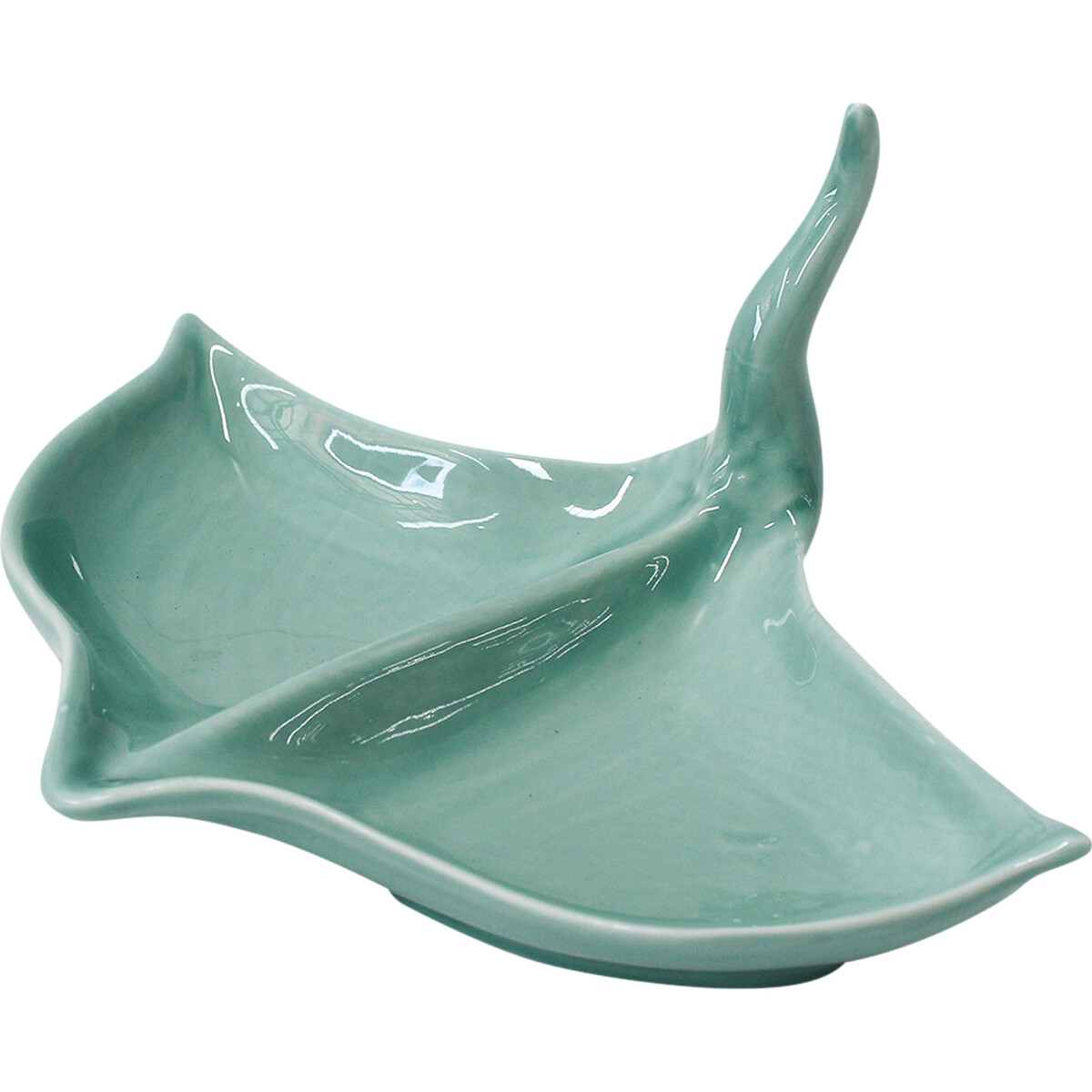 The Stingray Plate Seafoam is a remarkably crafted plate that is also worthy of being considered as an ornament in its own right. This is because it is made in such an aesthetically charged form in the semblance of a stingray fish. It depicts the stingray's shape and even includes the stingray's long tail from which the fish got its name in the first place. It is made in a charming sea green palette.