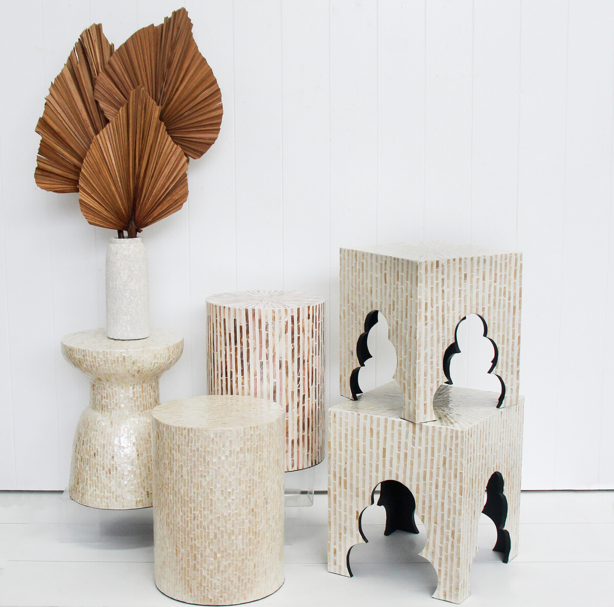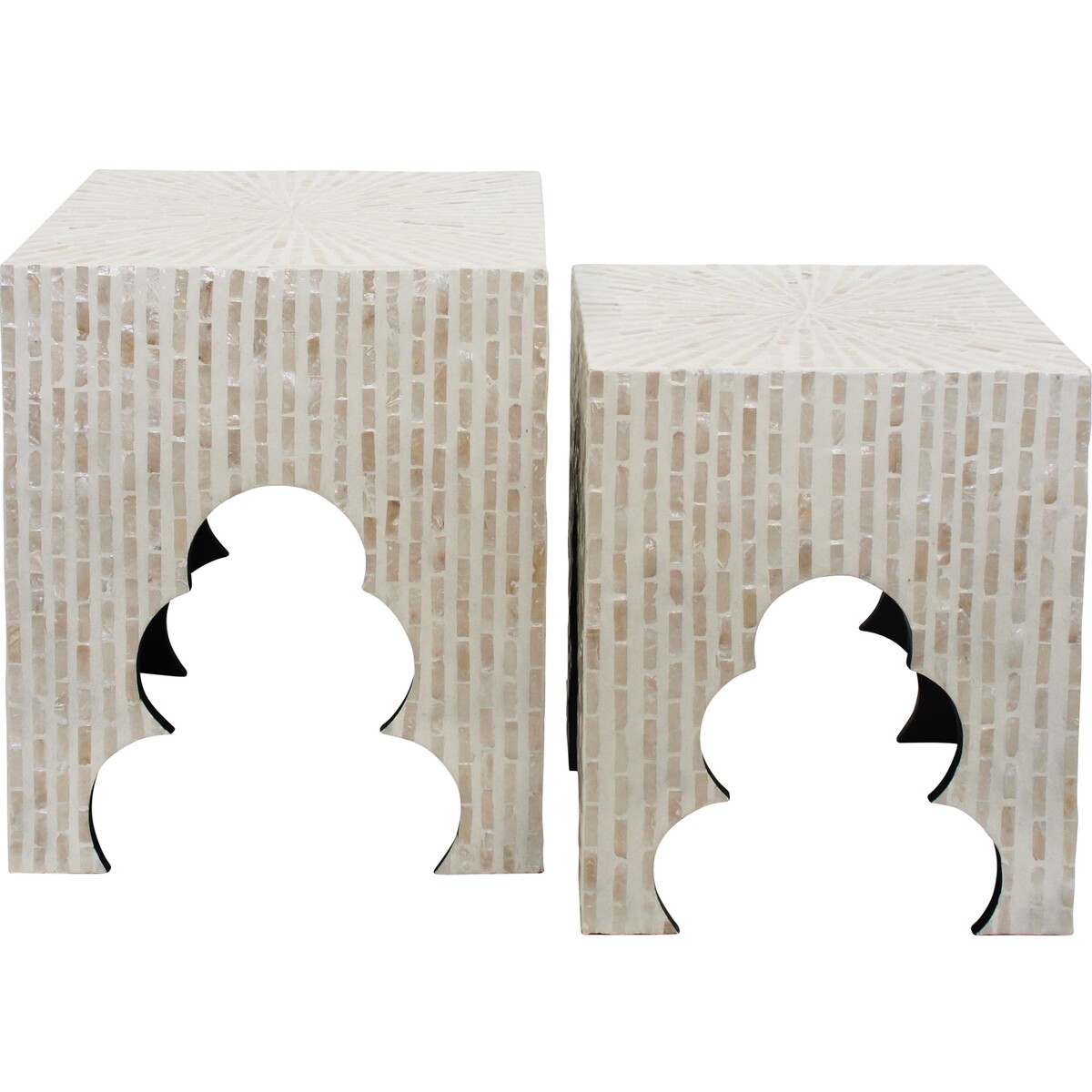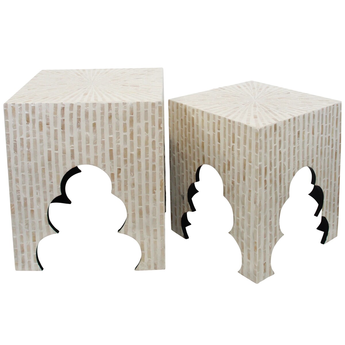 With the large sized stool of this Caribbean stools crafted in a fairly large sized dimension which measures 40 centimetres in length, 40 centimetres in width and stands at 47 centimetres in height. The medium sized stool on the other hand, is made in a moderate size which measures 35 centimetres in length, 35 centimetres in width and 42 centimetres in height. Towards the base, and marking the stands of both stools are cut-in designs of pine tree shapes which ornaments these stools. Please note that it is a fragile product and has to be transported on a pellet.