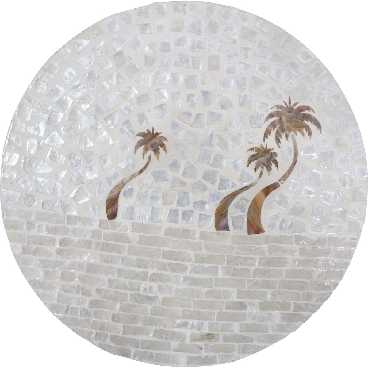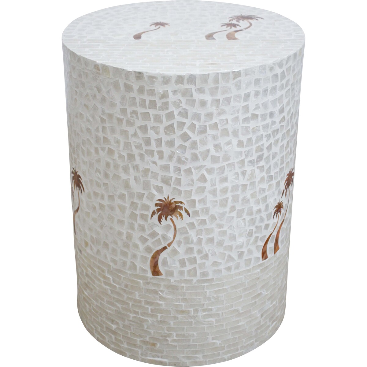 The Stool Natural Palm features an intricate mosaic design, with each tiny piece of Capiz shell thoughtfully positioned to create a serene image of palm trees that evokes the calmness of a tropical retreat. Its neutral colour palette allows it to blend harmoniously with various home or office decors, from minimalist to more vibrant settings.