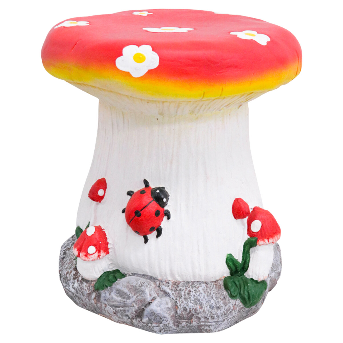 This stool/ornament piece would be a fantastic addition to any outdoor garden collection. We do suggest using it in an undercover area or patio, but otherwise it is an outdoor piece. If your customers are looking for something playful, maybe even a bit whimsical for their gardens, this is perfect. They don't necessarily need to use it as a stool because it works well as simply an ornament piece too. The bright red cap with flowers design is a beautiful detail that can add some life and colour to a garden or patio.